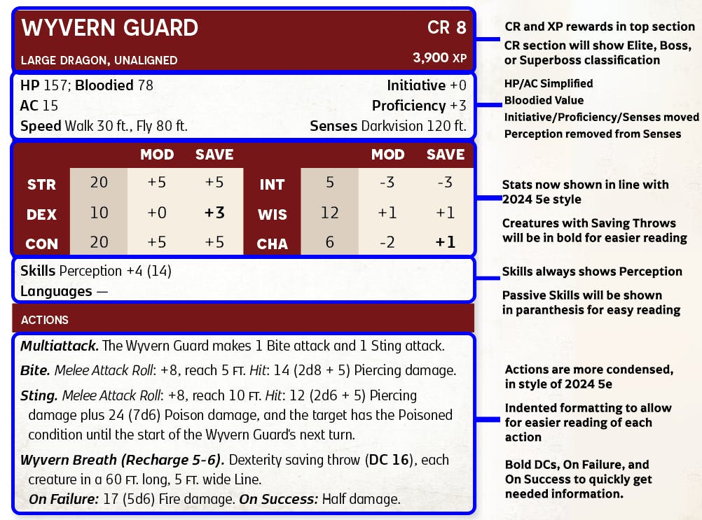 I've been working hard to get a new stat block to align with 2024 5e's design. For the most part, I've enjoyed the latest design in the 2024 version of 5e, so I went ahead and redesigned our stat block to be more in line. In addition, I've taken inspiration from earlier versions of stat blocks, like 4e, to help present information necessary for GMs while condensing space on the stat block itself. This has led to a ton of page space, allowing me to add more stat blocks and even lore entries onto the page.