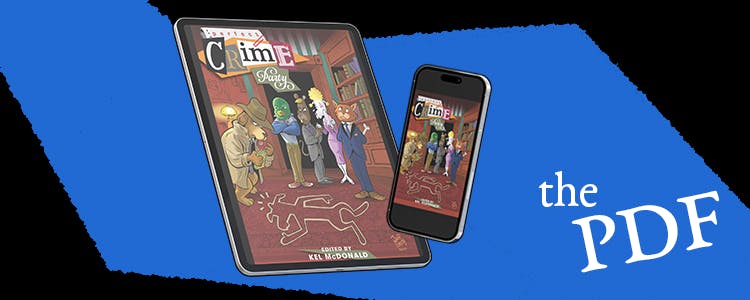 For $30, you can get a physical print copy of Perfect Crime Party. It'sa 6.625 inch × 10.25 inch, full-color volume with 25 stories, and extra art in the back! And for the crowdfund only, it will be accompanied by a free DRM-free PDF ebook with purchase!