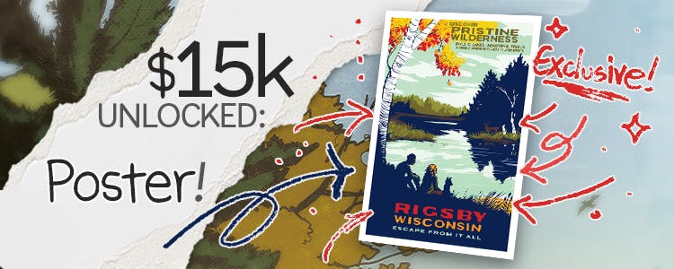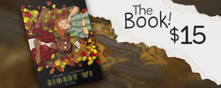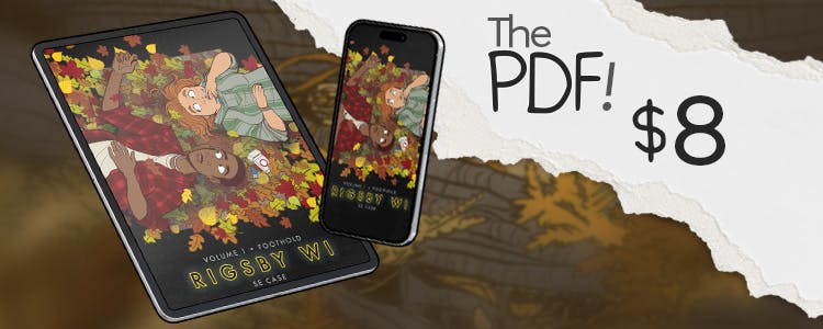 For $15, you can get a physical print copy of Rigsby WI - Volume 1: Foothold. It'sa 120-page, 6.625" × 10.25", full-color volume! And for the crowdfund only, it will be accompanied by a free PDF ebook edition, too!