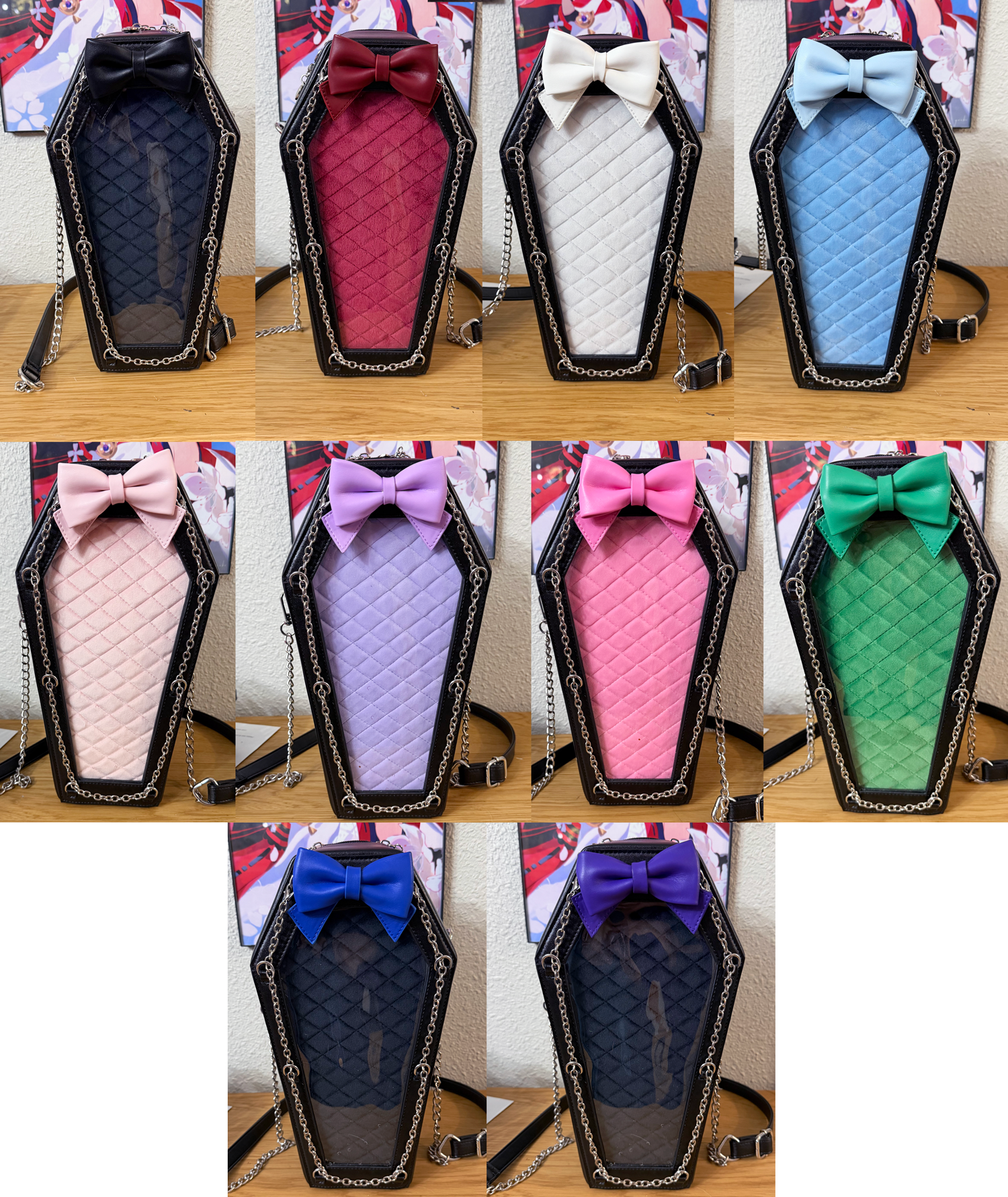 Hey all !! Thanks for the patience !! I wanted to let you know the pins are all in production, samples are being made and I'll send photos once they've been done ! I also have photos of the inserts and bows ! They for some reason didn't send me the samples of the coffin standard ita inserts but they'll be the same color as the casual shaped ones so you can see both here ! I do have all the cushion colors and bow colors as well including the new royal blue and dark purple ! check out the photos below ! The manu has told me that the final samples of all bag colors should be finished soon ! They were on holiday and have given me an estimation of a week which means it'll probably be two weeks. I'll update with photos as soon as i can !