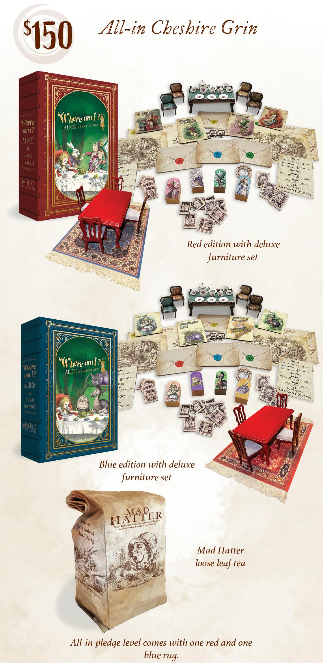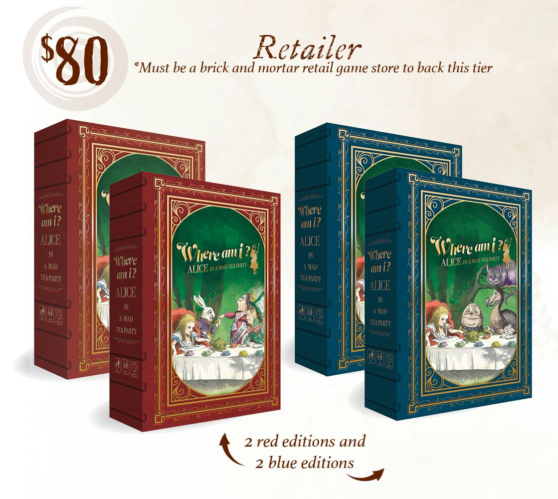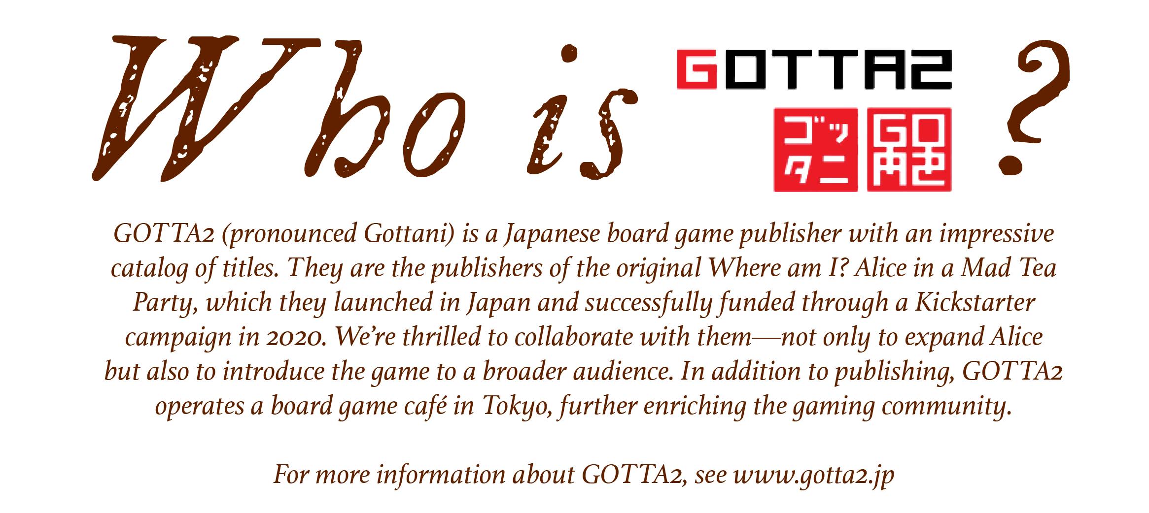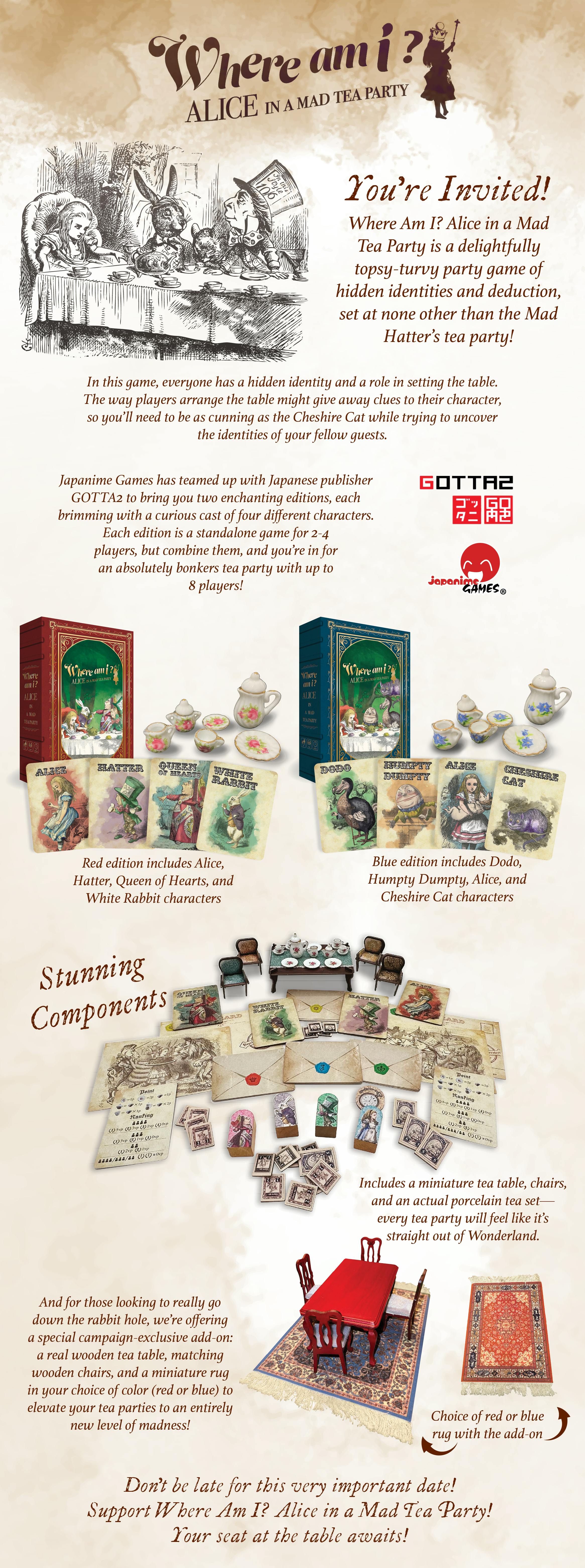 In 2020, Japanese publisher GOTTA2 crowdfunded and published a red box edition of Where am I? Alice in a Mad Tea Party. In this campaign, Japanime Games has worked with GOTTA2 to bring updated rules for 5 to 8 players when combined with the brand new Blue edition, and an extra 16 cards will be included in our new Red edition in order to be able to combine the Red and Blue editions for 5-8 player play. Owners of the original Red box from GOTTA2’s 2020 Kickstarter can pick up the add-on upgrade pack that includes 16 extra cards along with a Blue edition in order to play up to 8 players.