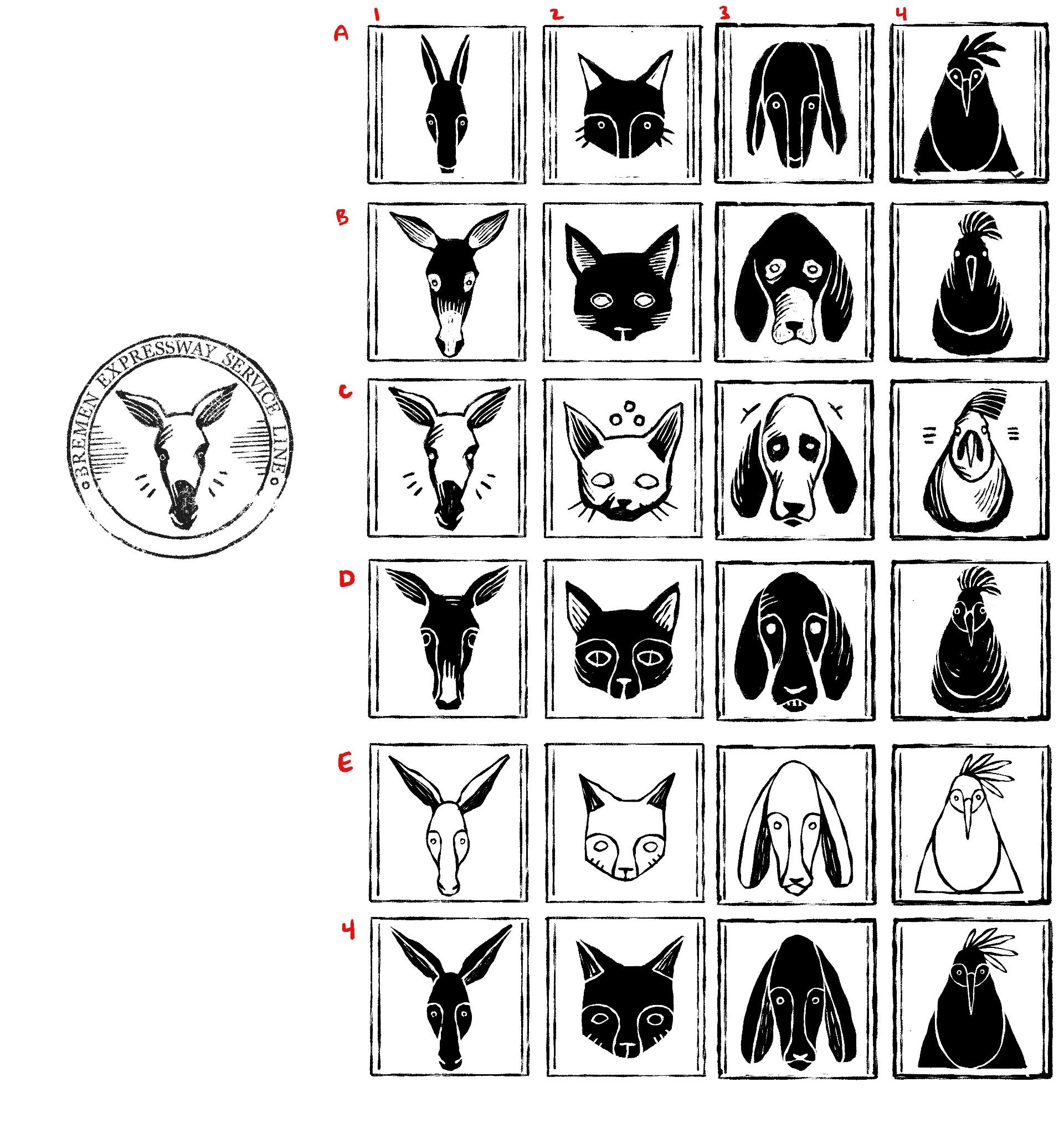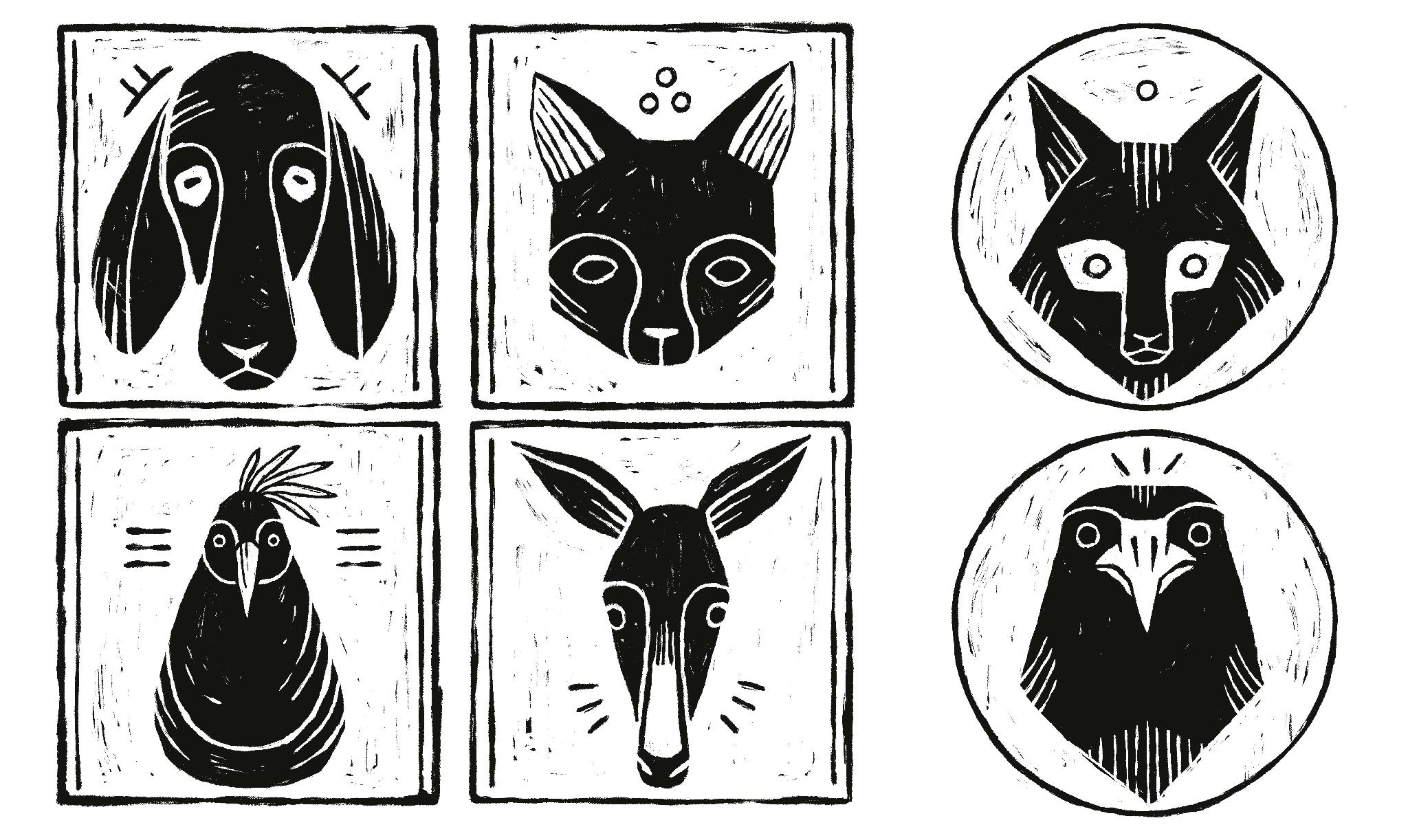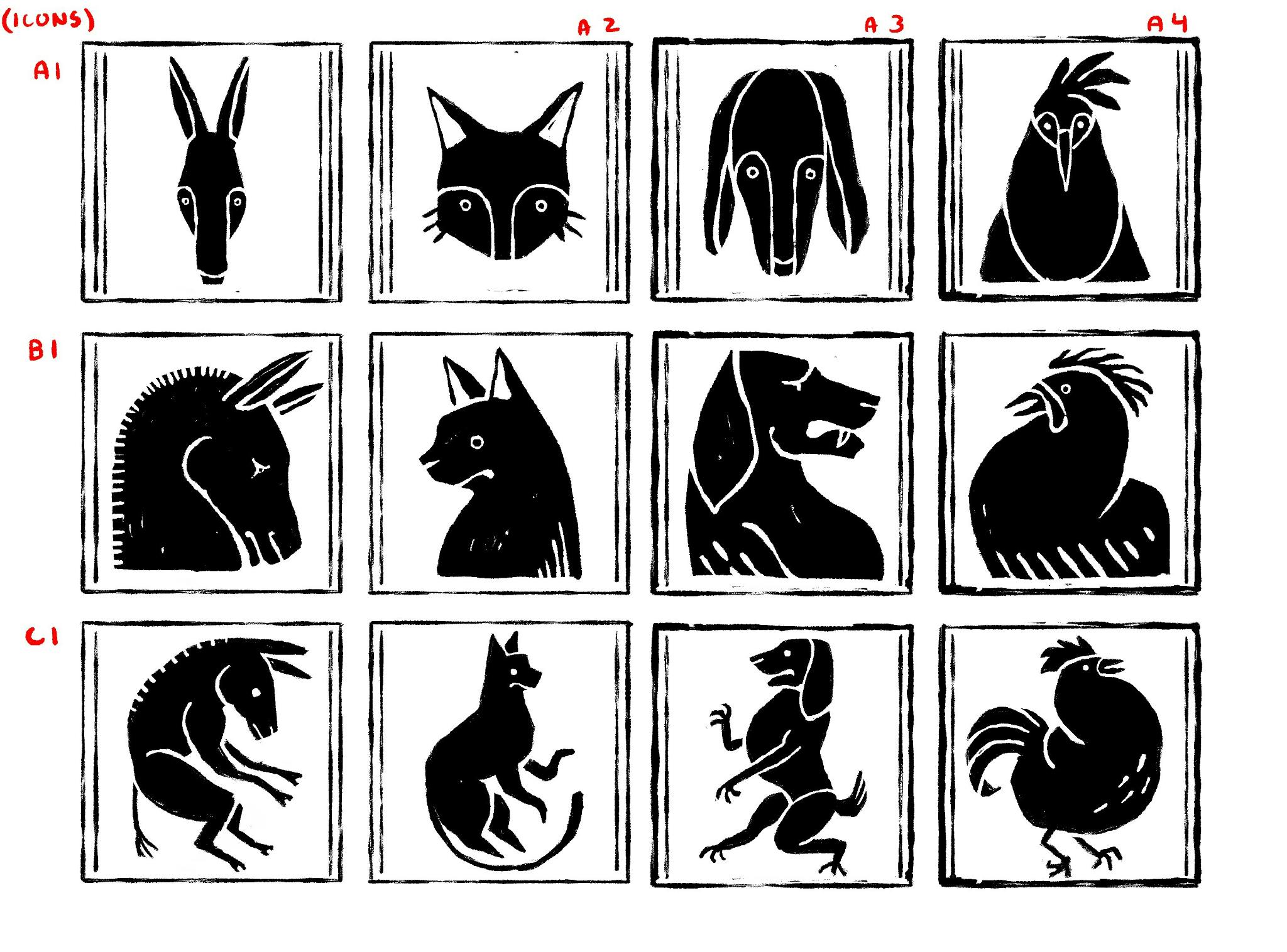 Even before I began preliminary conversations with Conner, I knew that every member of the band would have their own icon. I came in with a clear set of goals and outcomes: these distinct icons needed to be immediately recognizable as animals, easy to differentiate from one another at a moment's glance, and just as legible in light-on-dark printing as in dark-on-light.