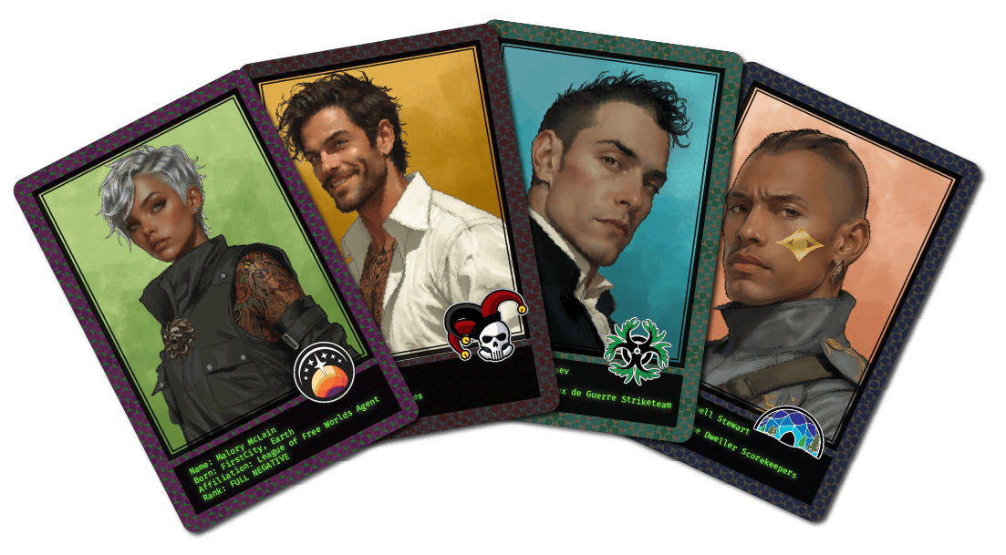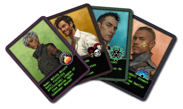 2.5" x 3.5" (Trading card-sized) cards for your favorite characters. At launch, we will have four available, one from each Faction; Malory McLain for the League, Zakhariy Zaytsev for the Wilders, Stewart Campbell for the Dome Dwellers, and Bloody Jester for the Pirates. $4