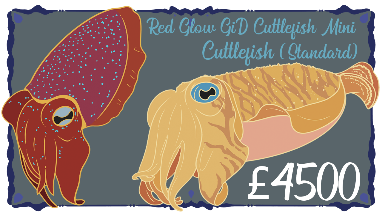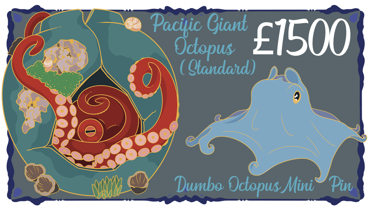 Pledge within the first 48 hours to receive a free rainbow cuttlefish mini pin. Returning backers will receive a free orange dumbo octopus mini pin. Both mini pins are 1.5", with gold metal finish and screen printed details.
