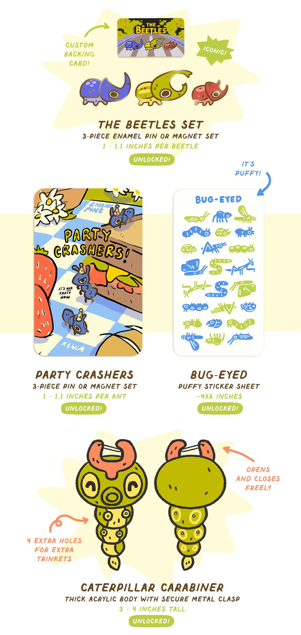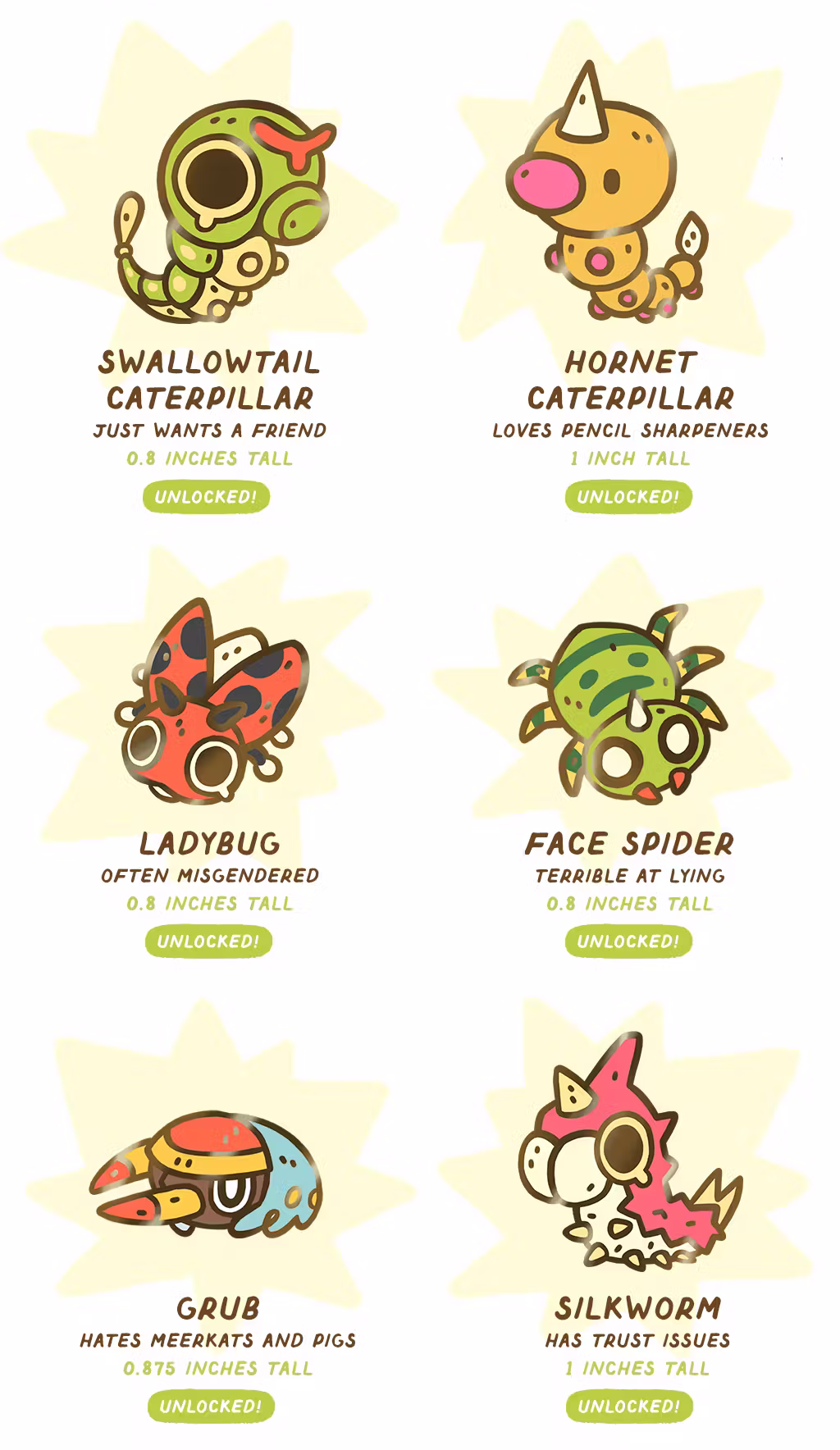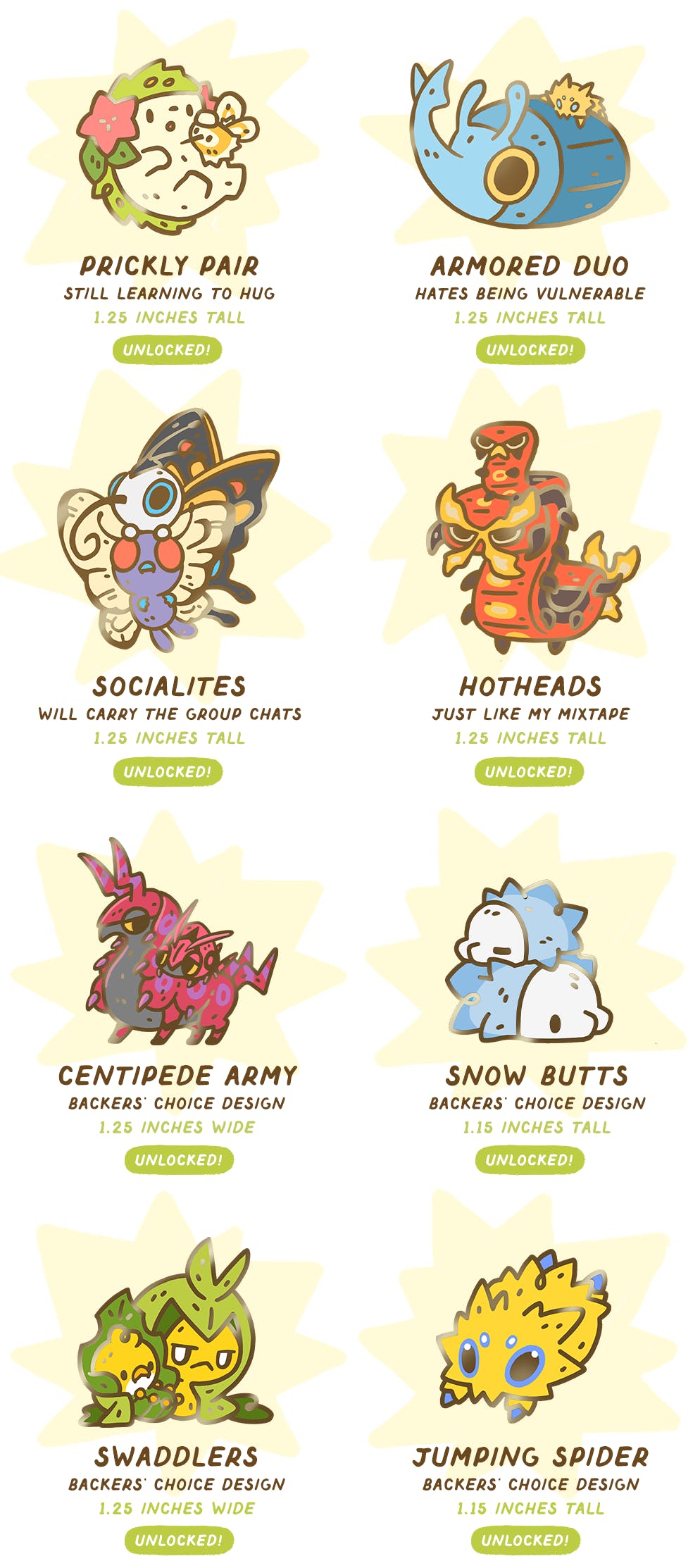 These designs have now been revealed! Any unlocked designs will be available as Add-ons after the campaign is over. Pocket Bug Duos include pairs that feel inseparable and include Backers’ Choice designs, where you decide what bugs can be added to the collection 🐛✨