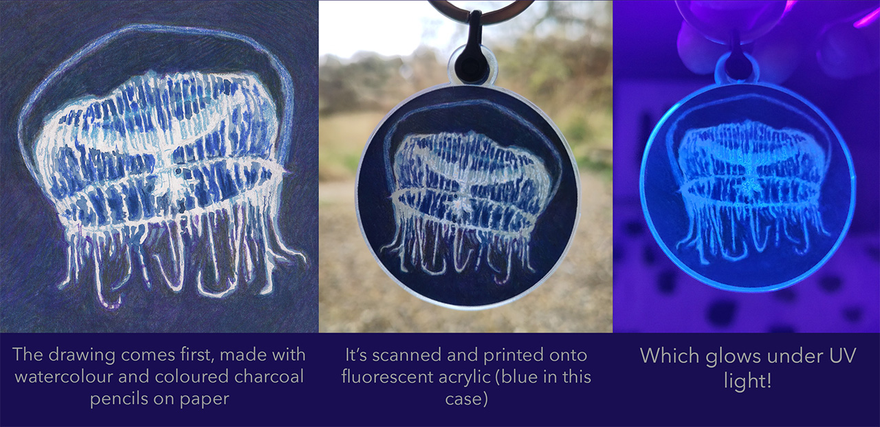 I'm delighted to reveal the first of my designs for this upcoming project - I'm planning four fluorescent acrylic keychains, inspired by jellyfish. Here's the blue one - it's a crystal jelly (Aequorea victoria)!