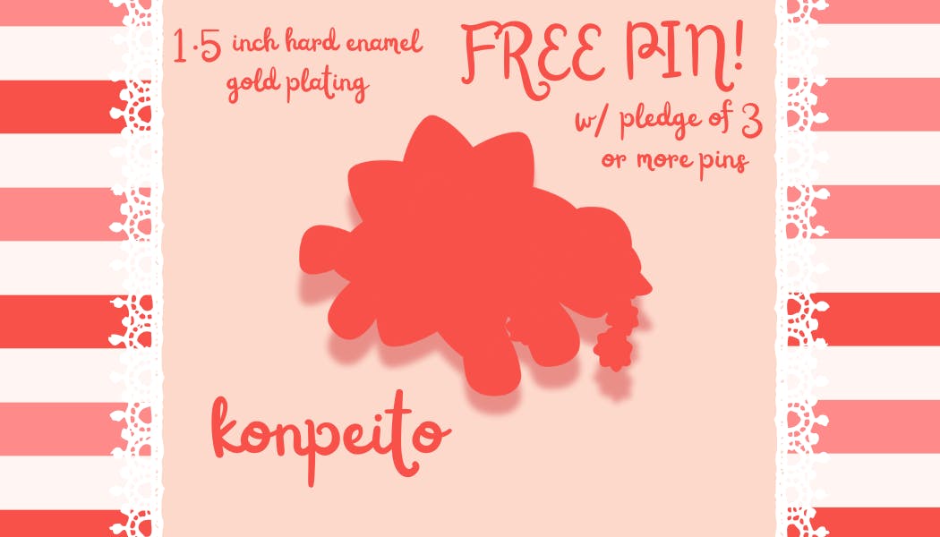 That's right! As a thank you for your support, the regular version of the Konpeito pin will be FREE with all pledges of more than three pins! Additionally, once Shiny Konpeito unlocks, every backer who is eligible for the free pin will have the choice between the regular and shiny variants!