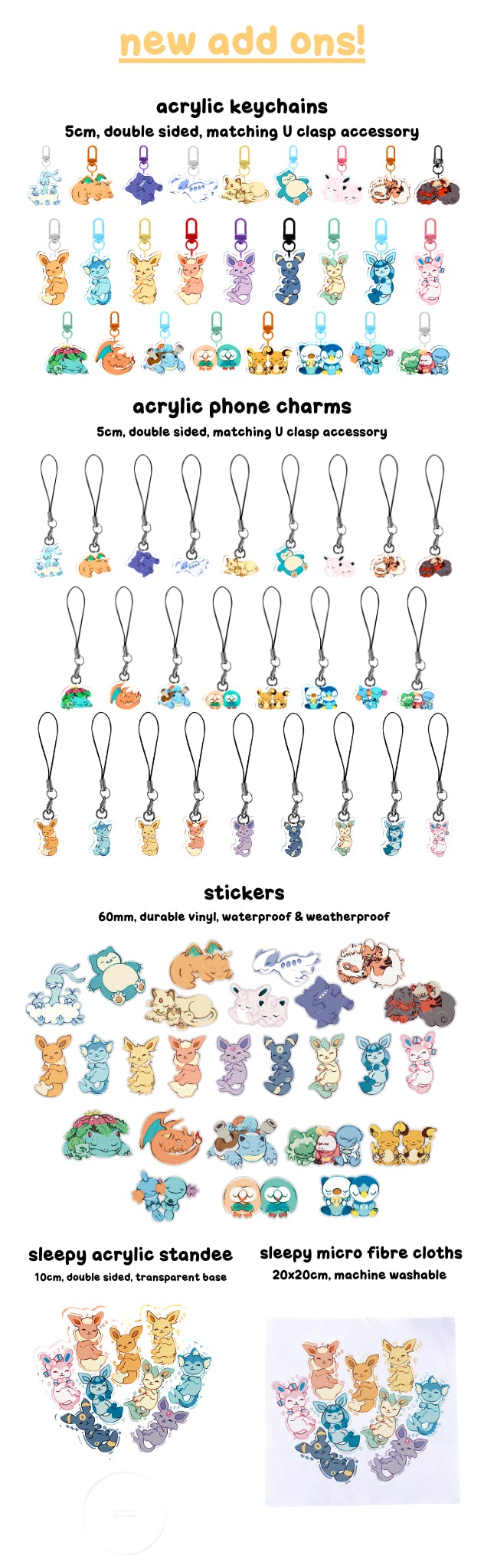 There is: ⋆ keychain ⋆ phone charms ⋆ stickers ⋆ standee ⋆ micro fibre cloth
