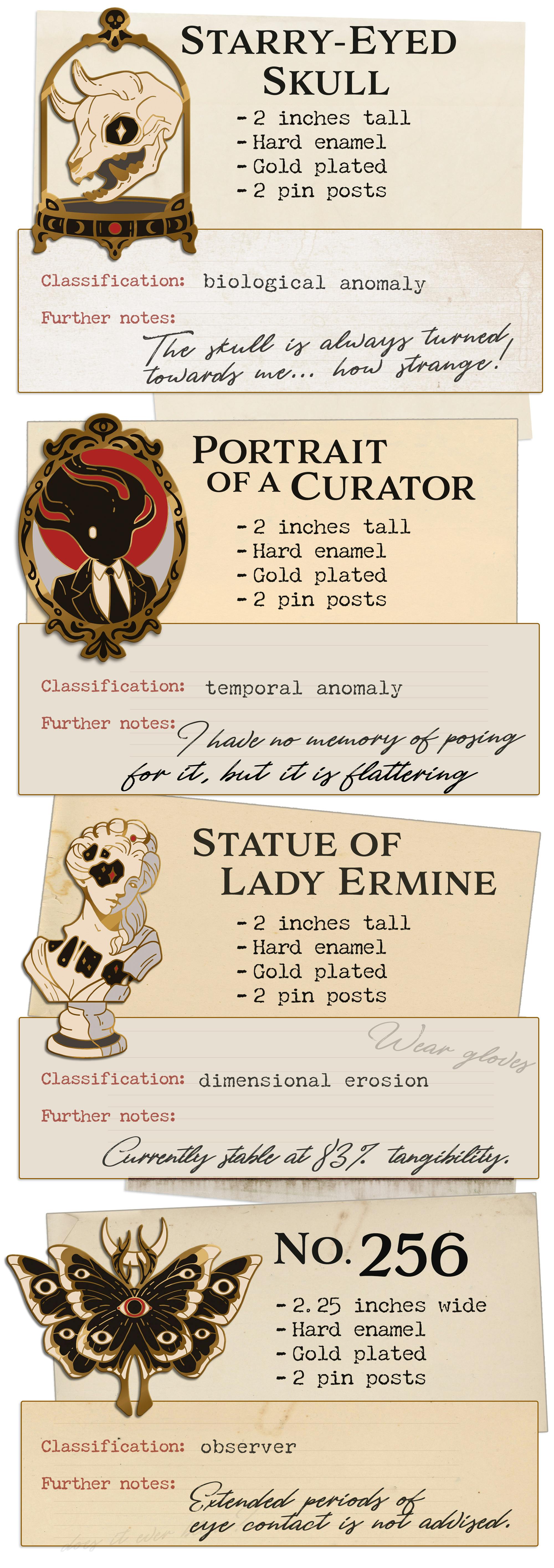 Moon Hollow Archive is an occult, 'cabinet of curiosities' themed enamel pin set! Discover a treasure that resonates with you... and only you.