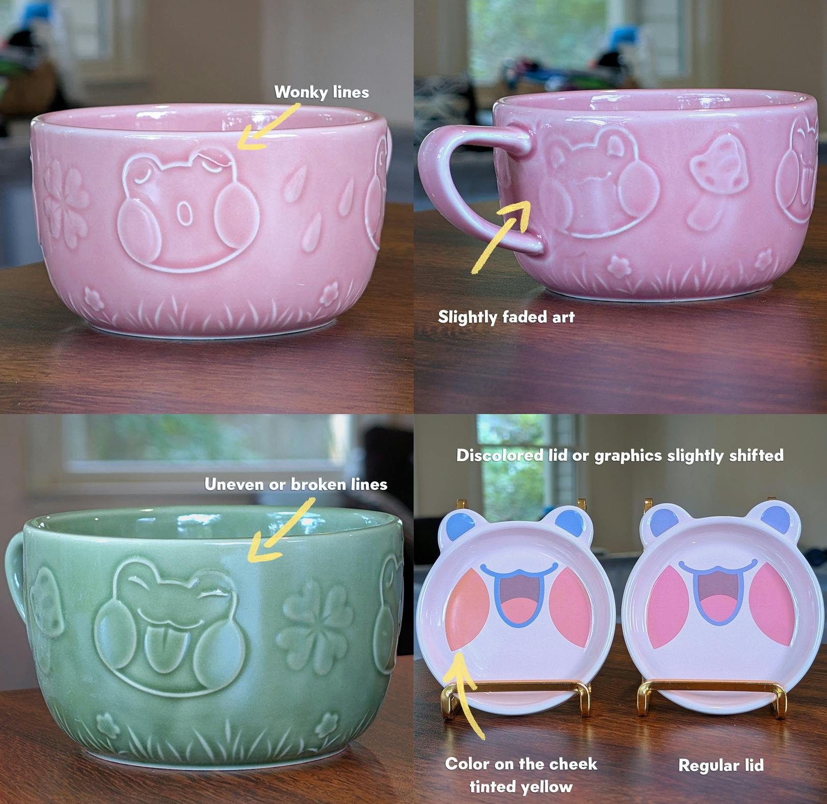 "Derpy" Rani the Froggie Ceramic Mug & Lid Sets The same Rani ceramic mugs you love, but with slight defects and big discounts! The defects in these mugs do not affect their functionality at all - it's entirely cosmetic! The pictures here are examples of what you may get, but please keep in mind each set is one of a kind! No two Derpy sets are the same.