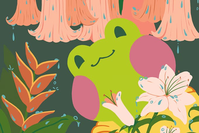 Rani surrounded by tropical flowers. Illustrated April 2022. He's changed quite a bit since his first appearance!