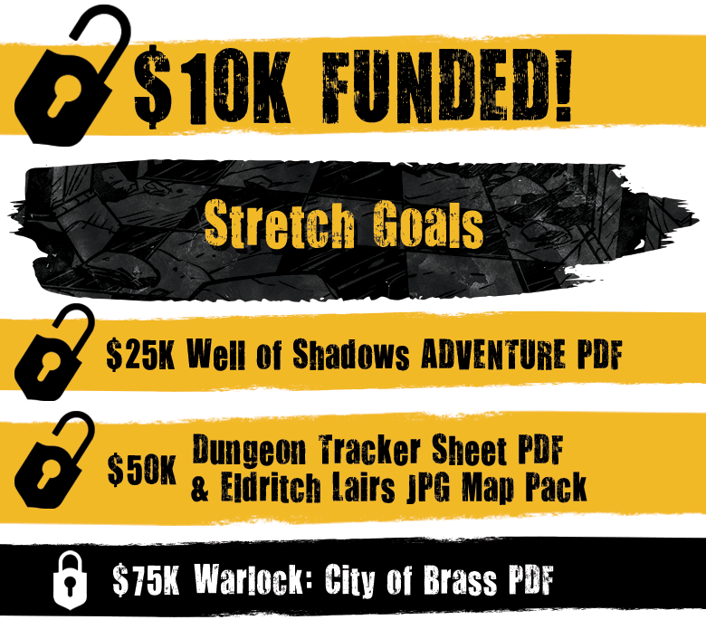 Next up: at $75k backers unlock a slightly less dungeon-y but still very Old School bonus item, the Warlock: City of Brass PDF for 5E adventuring in those fiery halls!