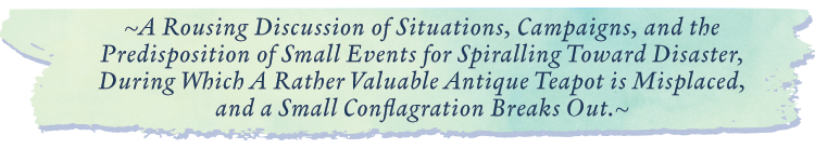 Unlike traditional roleplaying adventures, situation notes provide a loose collection of themes, goals, plot twists, and other elements to complicate and deepen the situation. These notes, along with your Haphazardry and Betweentimes twists, random encounters outlined in the book, and the threat of an appearance by your Appalling Relatives, provide ample opportunities for a previously simple task to spiral perilously close to out of control.