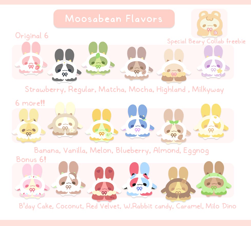 I finally hopped on the strawberry cow trend!! I am so excited to share our little Moosabean friends, who are inspired from tasty milk flavored drinks and desserts! This will be my 6th crowdfunding project and I am really excited to finally bring these friends to life! Not only will your pledge help with production costs, but you will also receive these cuties at a discounted price before it goes up on our official store!