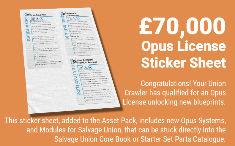 This adds the 'Opus License Sticker Sheet' for everyone with an asset pack. This sheet includes new Systems and Modules which you can paste directly into your Salvage Union Core Book, or Starter Set Parts Catalogue.