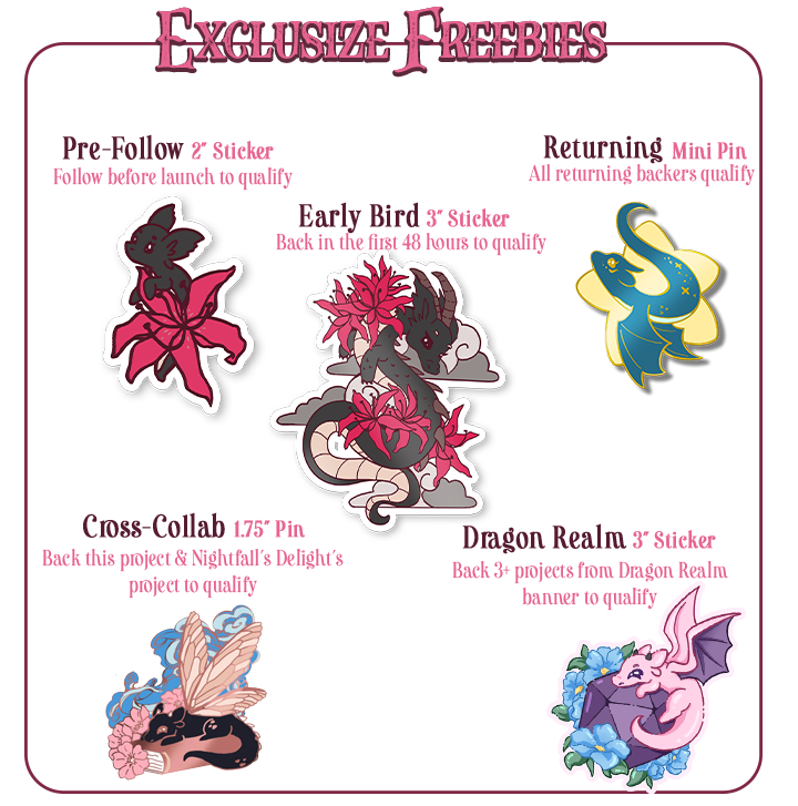 Our gardens have new guests: dragons! They each rest among the sunflowers, lilies, hydrangeas, and other blooms in these 1.8–2” pins, framed by flowers and drifting clouds.