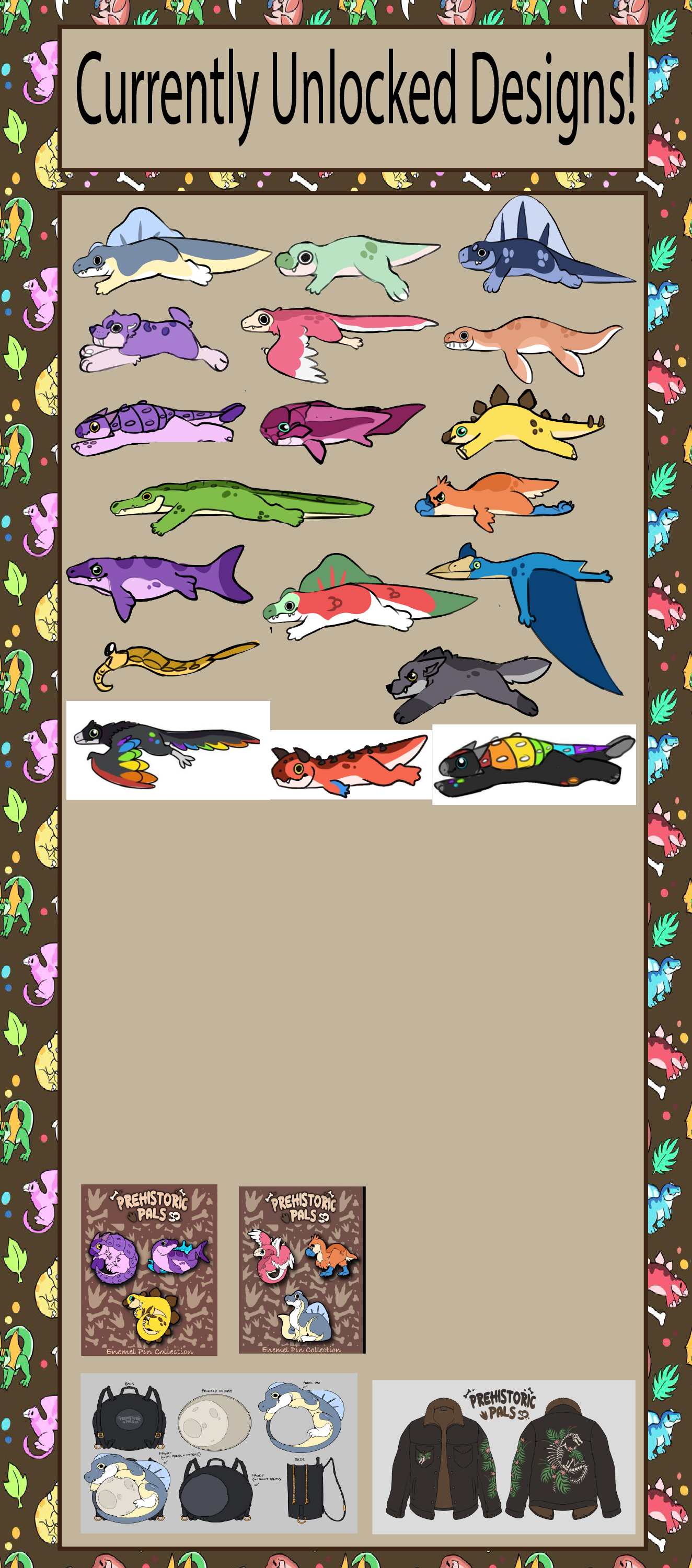 As well as stretch goals, i wanted to share the full list of currently unlocked designs (Those not yet designed are listed below the artwork) Not shown - megalodon - winner of new community vote