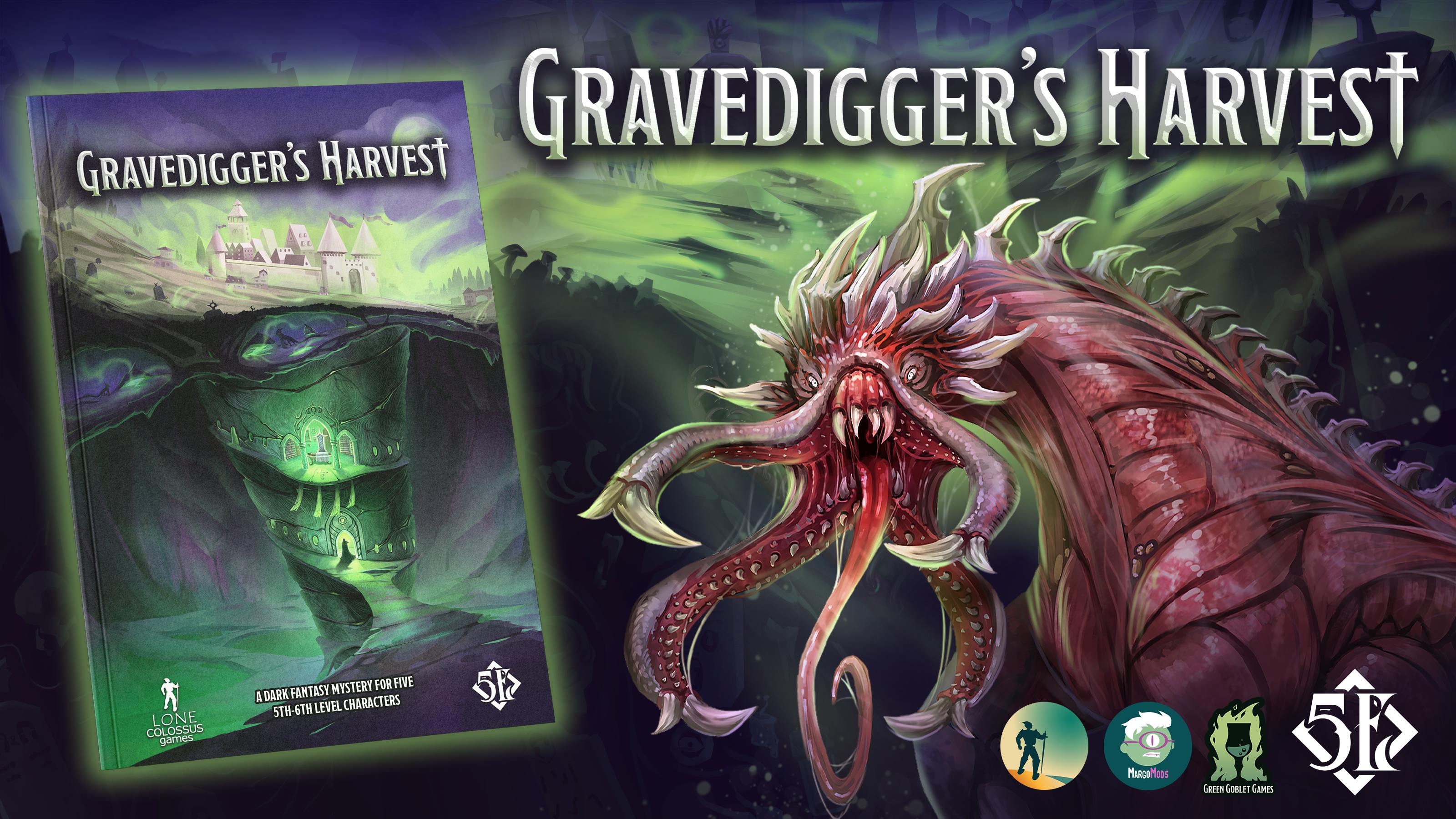 Gravedigger's Harvest is a dark fantasy mystery adventure inspired by the Ritual and Harvesting systems from Tome of Intangible Treasures II. In it, players will explore a closed ecosystem of new, fully-illustrated monsters and strange cultists in an intricate scenario with multiple approaches to solving Gilliksburgh's cyclic mystery.