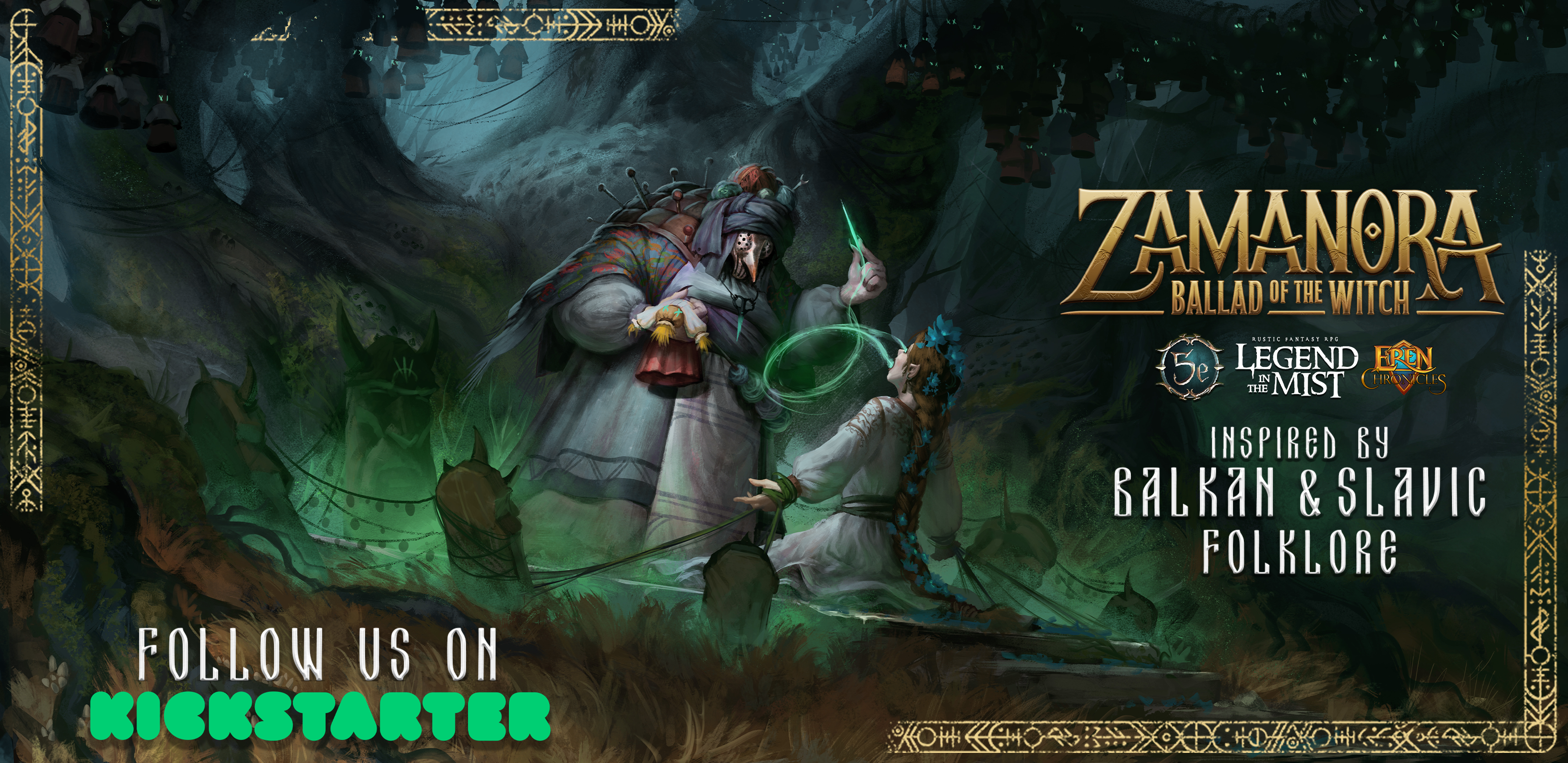 ZAMANORA: Ballad of the Witch introduces immersive mechanics, character options, monsters, spells, curses, ceremonies, folkloric relics and adventure locales sprung from the realm of myth. Moreover, everything is going to be compatible with a number of different TTRPG systems: namely D&D 5e, D&D 2024, and the Legend in the Mist RPG.