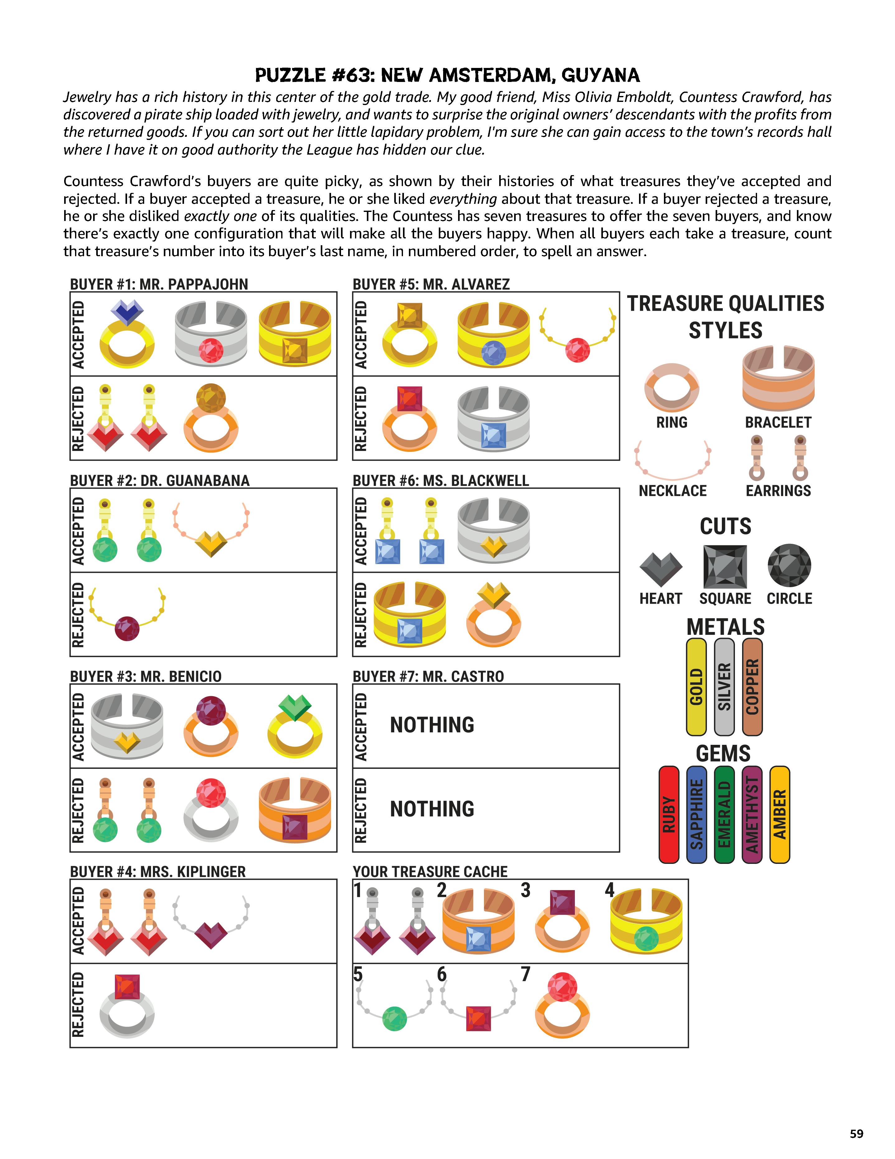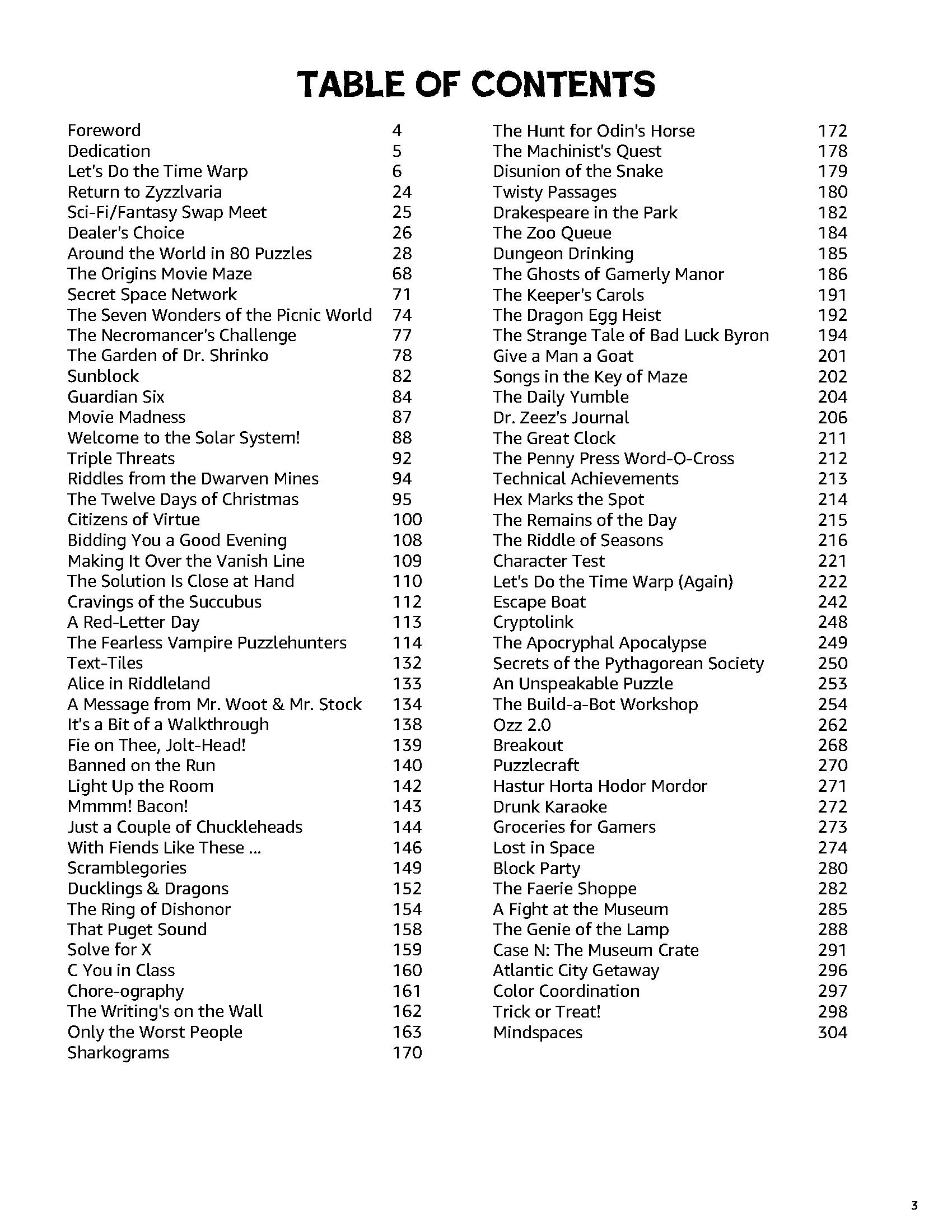 The puzzle hunts are then organized by year. You can see by the page gaps that some of them are very big. In addition to a large number of Gen Con Puzzle Hunts, there are other big events from conventions, ARGs, escape rooms, and manhunts. (This week, we giggled over that Running Man trailer, which did look like events we ran in the late 2000s. But with fewer guns and bombs.) Here's a logic puzzle from the Doomsday Rally, a world-spanning creation with puzzles from more than 50 different countries.