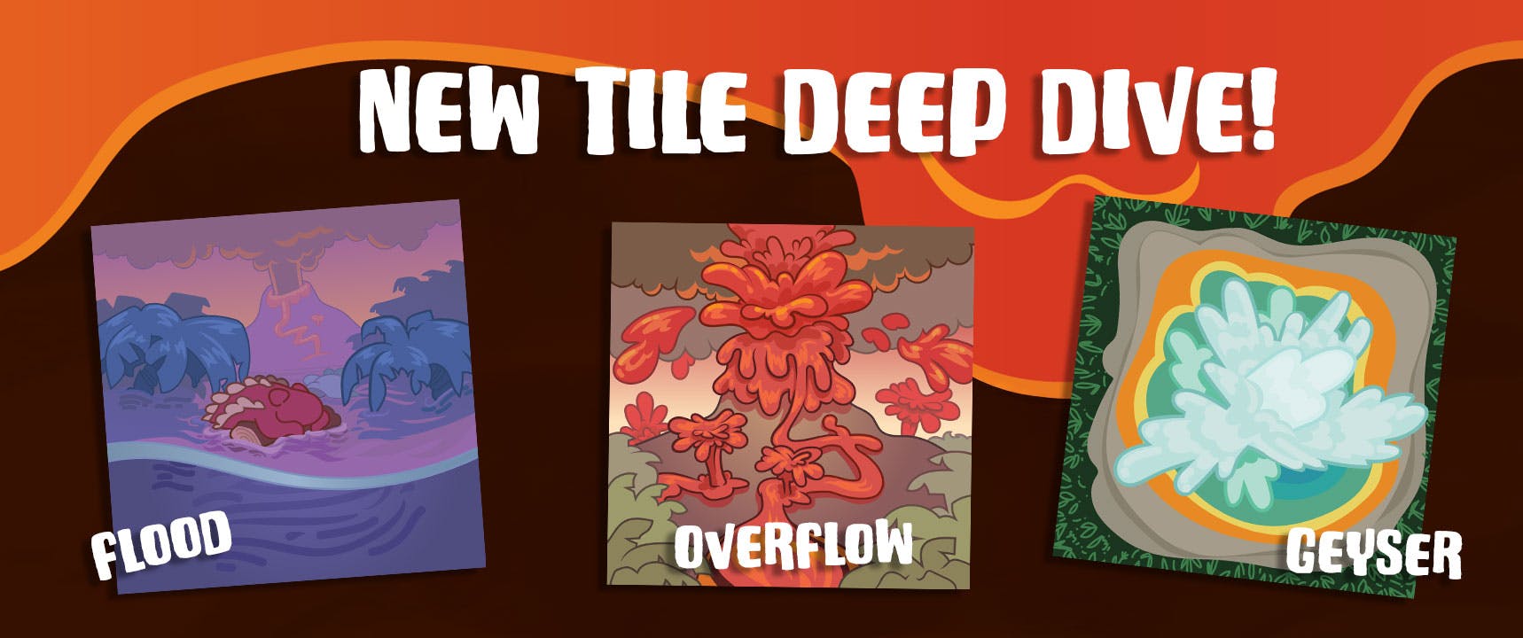 - Geyser - These tiles can be played on an empty square. Any dino ending their turn on a Geyser must move 1 additional square in any direction. Geyser tiles can only be covered by a Pit Tile, and cannot be covered up by a lava flow or boulder.