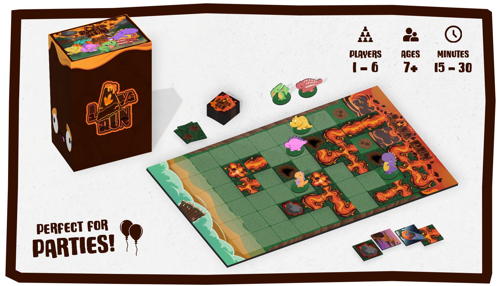 Lava Run is a craft-able board game about saving your dinosaur from a volcanic eruption! Place tiles to cleverly guide the lava as you move down the volcano. Use special tiles to mess with your opponents, all while trying to be the first dino to escape!