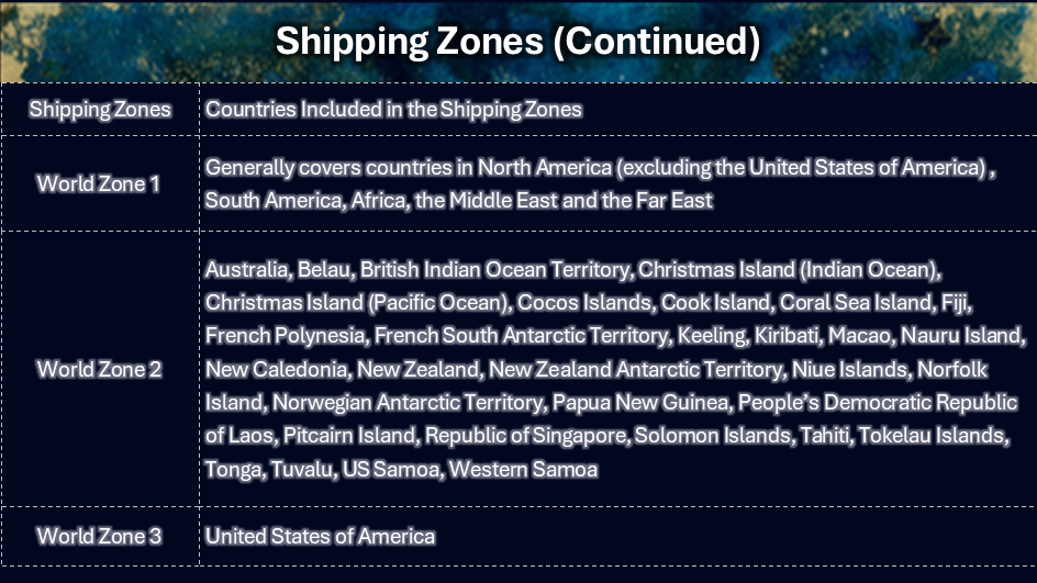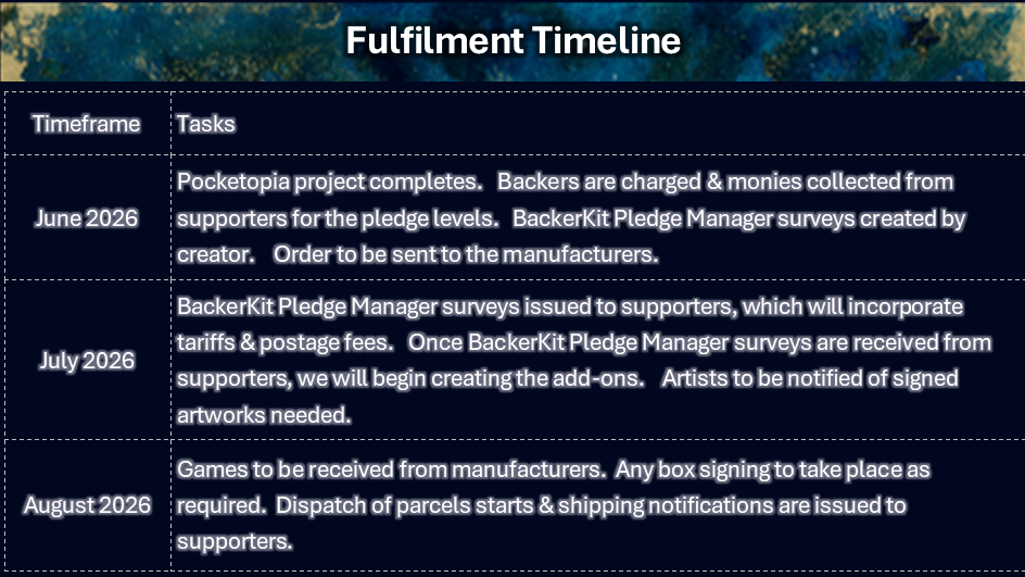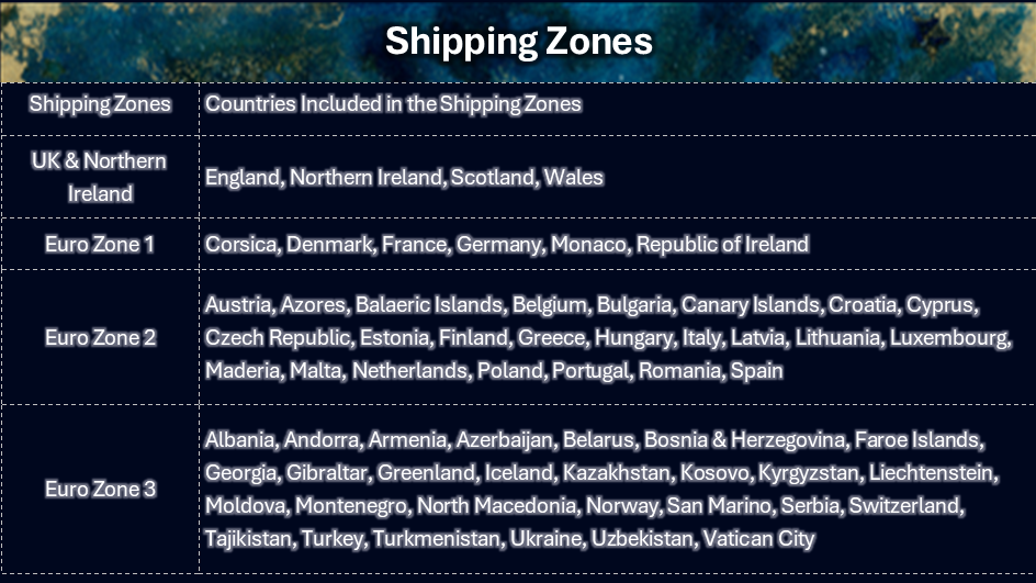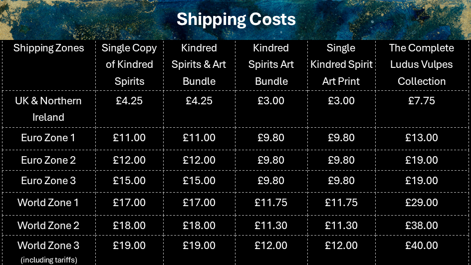 Please note that all pledge levels exclude shipping fees. The following table includes estimated shipping costs only. Any add-ons chosen either during the campaign, or in the pledge manager, may add to this shipping cost. For non-UK backers you will need to handle / pay for any customs duties / VAT imposed on the import of your reward. For any countries that attract tariffs, please be aware that this will be charged in the pledge manager. Please note that all items offered in this campaign have been made in the United Kingdom.