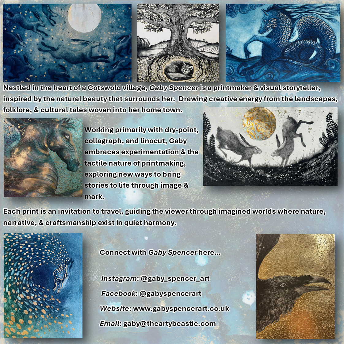 Kindred Spiritsfeatures stunning linoprint art from artist Gaby Spencer. Gaby helped bring the Spirits in Kindred Spirits to life, with her love of folklore & nature.