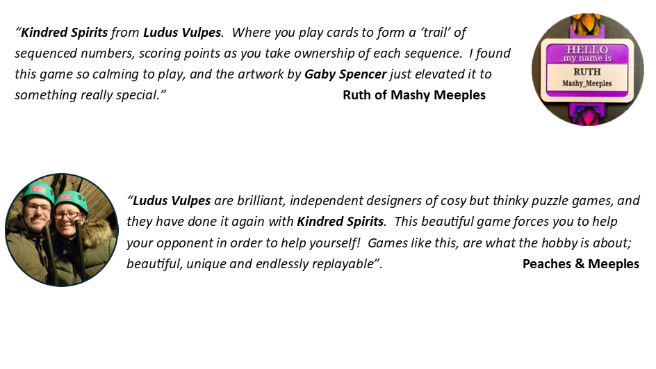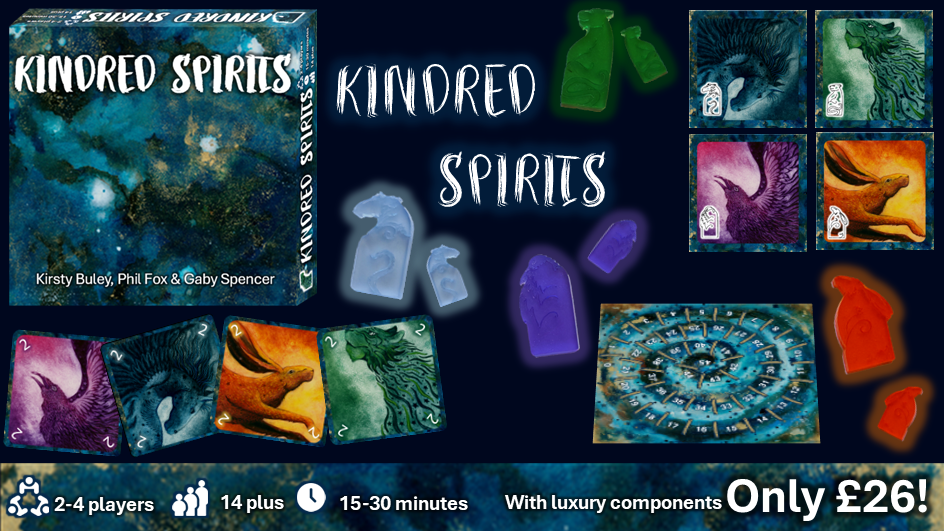 Kindred Spirits plays with 2 - 4 players and plays in approximately 15 to 30 minutes. The box is marked as 14 plus, as a legal requirement, as we have have not had the game CE or CA tested.