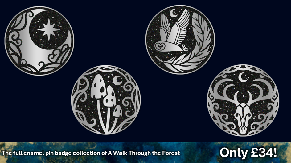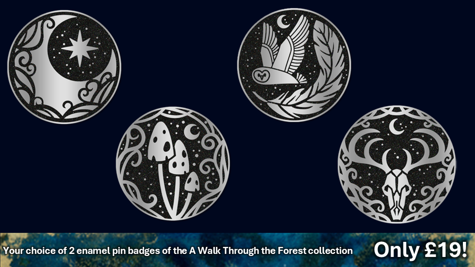 Two enamel pin badges of your choice, from the 'A Walk through the Forest' set.