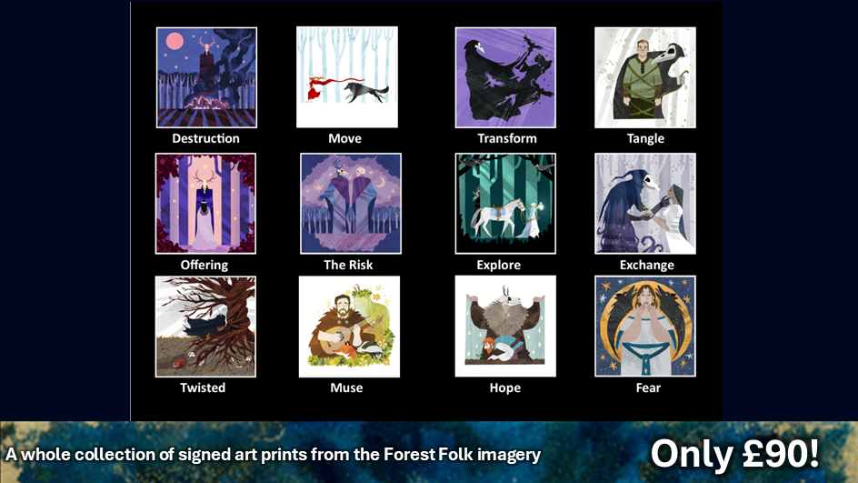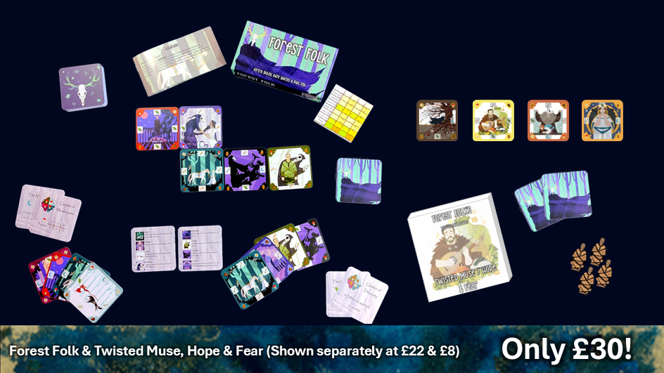 The Forest Folk card game featuring art from Kathryn Davies. Can you manipulate the forest to fulfil your pilgrim's wishes in just 9 cards? The Twisted Muse, Hope & Fear expansion allows players to manipulate the forest beyond recognition... It also adds a fifth player.