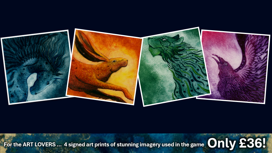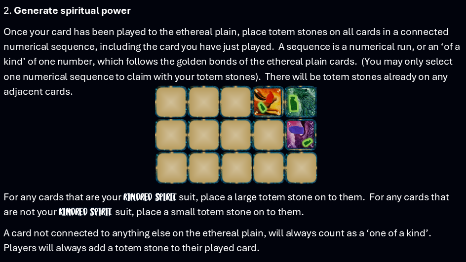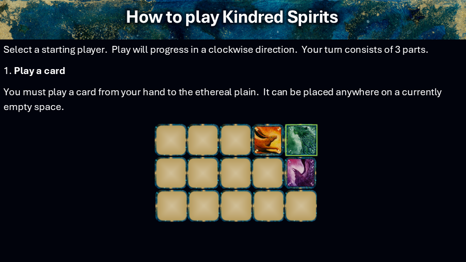 Play cards to the ethereal plain extending runs & capturing numerical of a kinds, which will generate your Kindred Spirit's power. This is a beautiful card game for 2-4 players, featuring stunning artwork by Gaby Spencer. Swirl your way to victory!