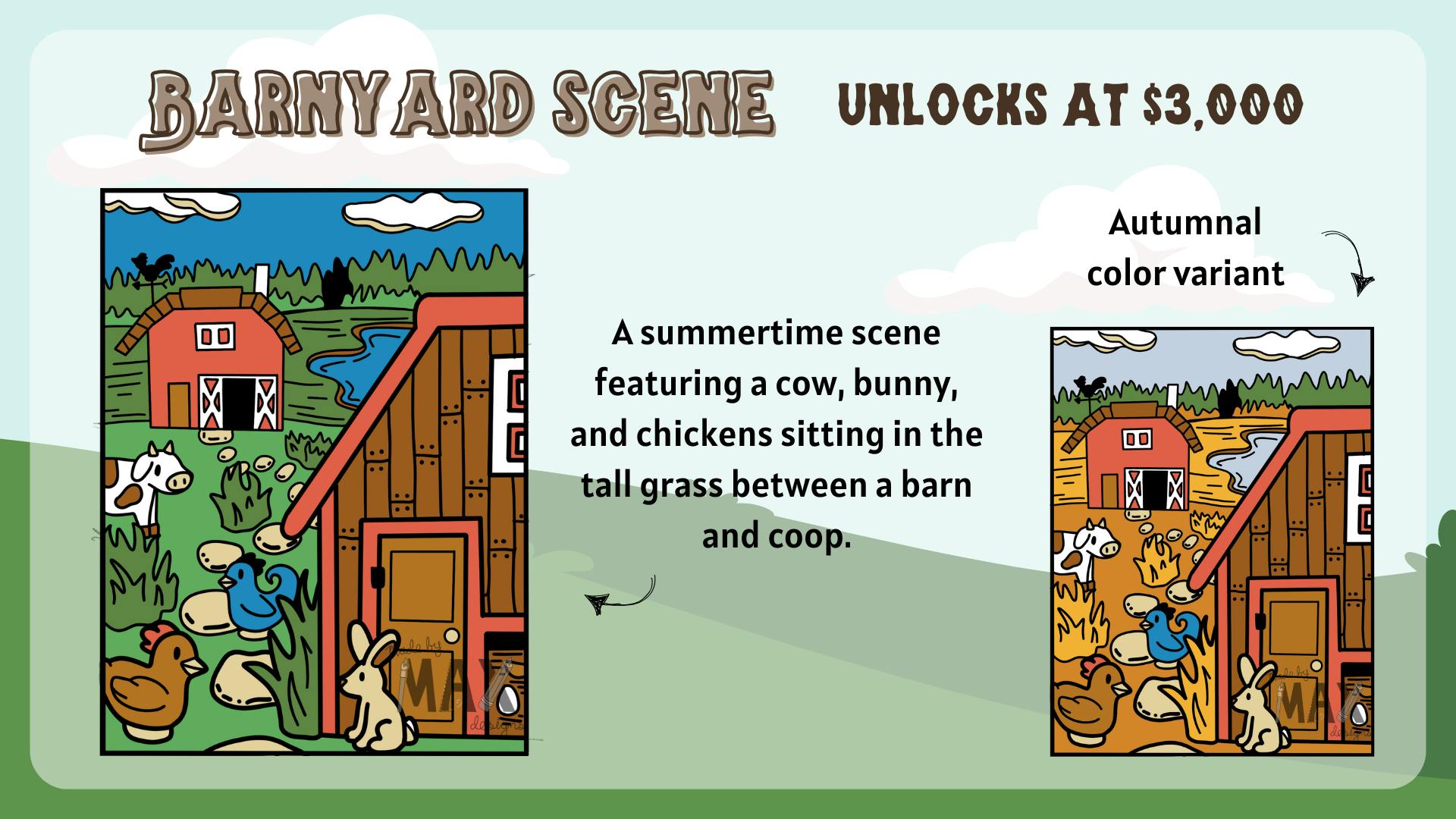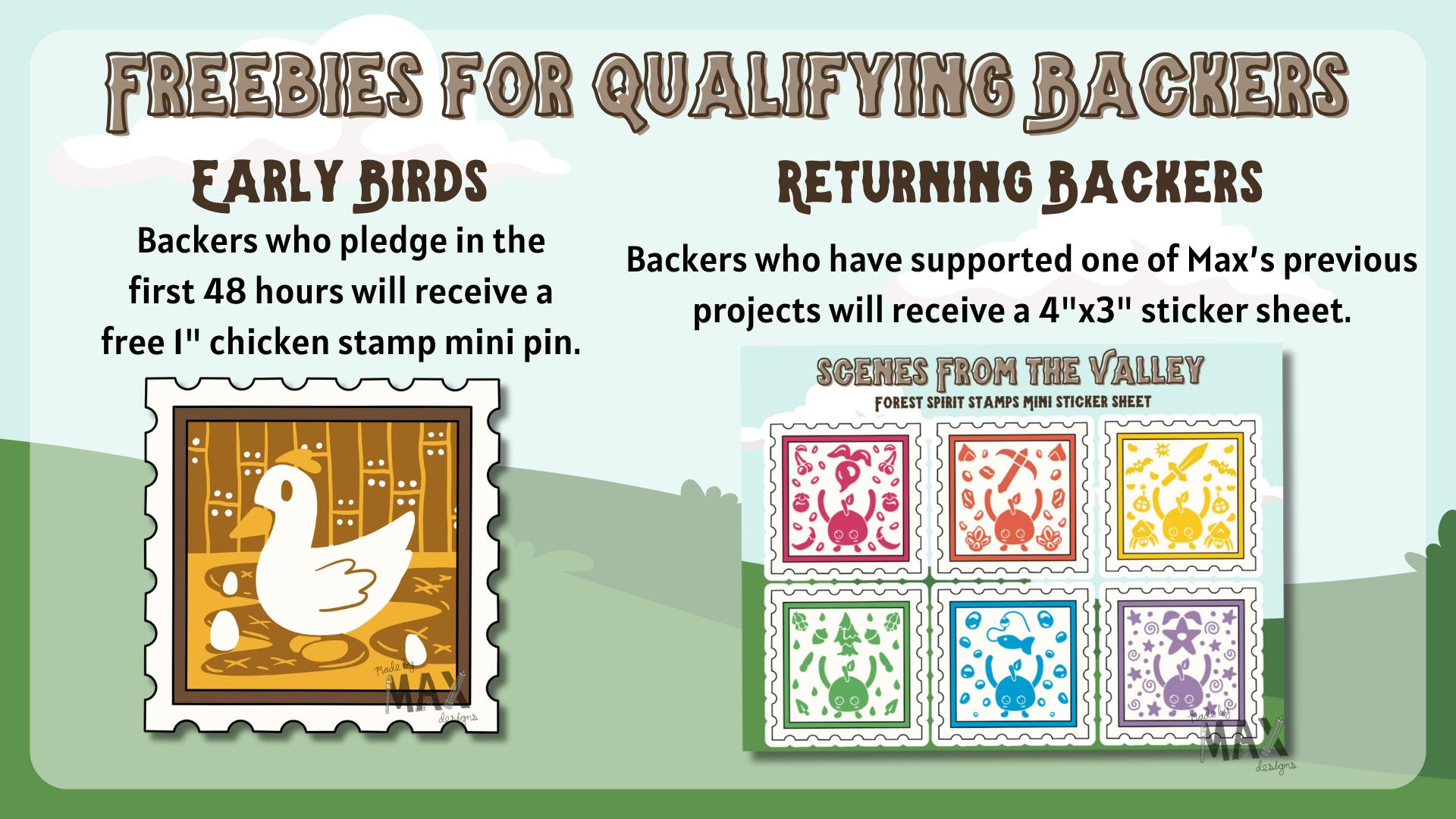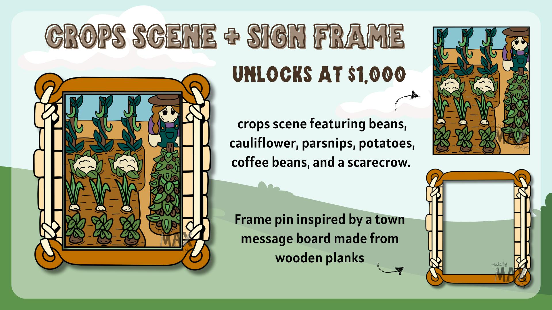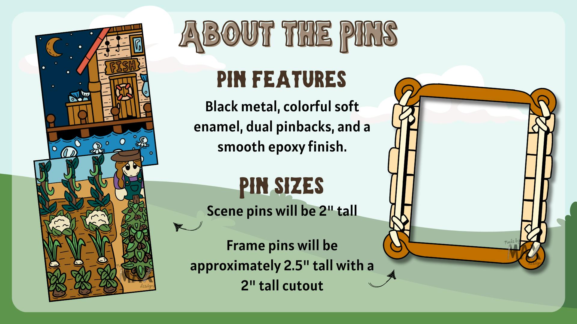 Welcome to the valley! This campaign features a collection of hand drawn scenes inspired by journeys as a farmer in a cozy video game world. Think of each scene as a snapshot in time - from the magical wizard's tower, to the monster in the mines, and the annual arrival of moonlight jellyfish on the pier. Choose a scene, customize it with your favorite frame pin, and collect mini stamps along the way.