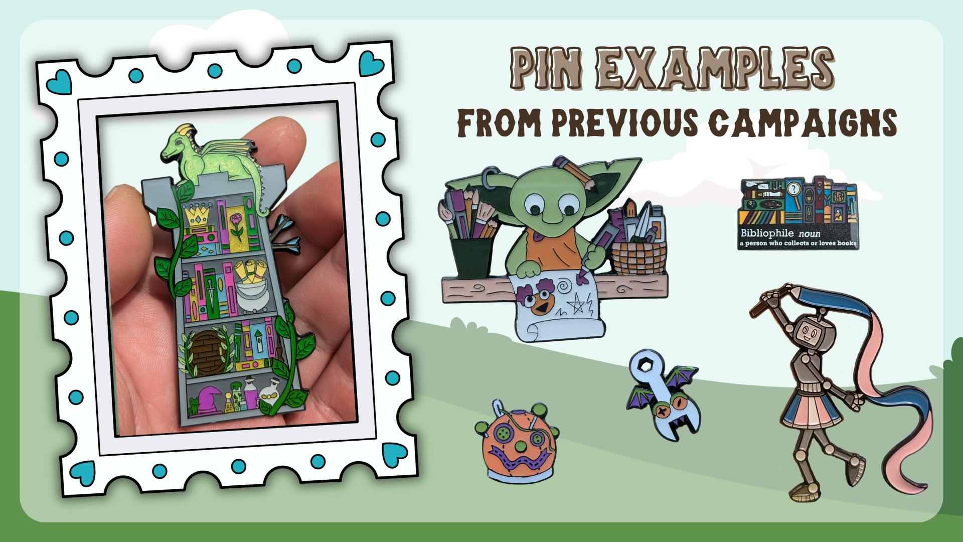 This enamel pin collection depicts the cozy adventures of a small town farmer in a world full of magic. This campaign includes scenes of five different locations and three styles of larger pins to frame them.