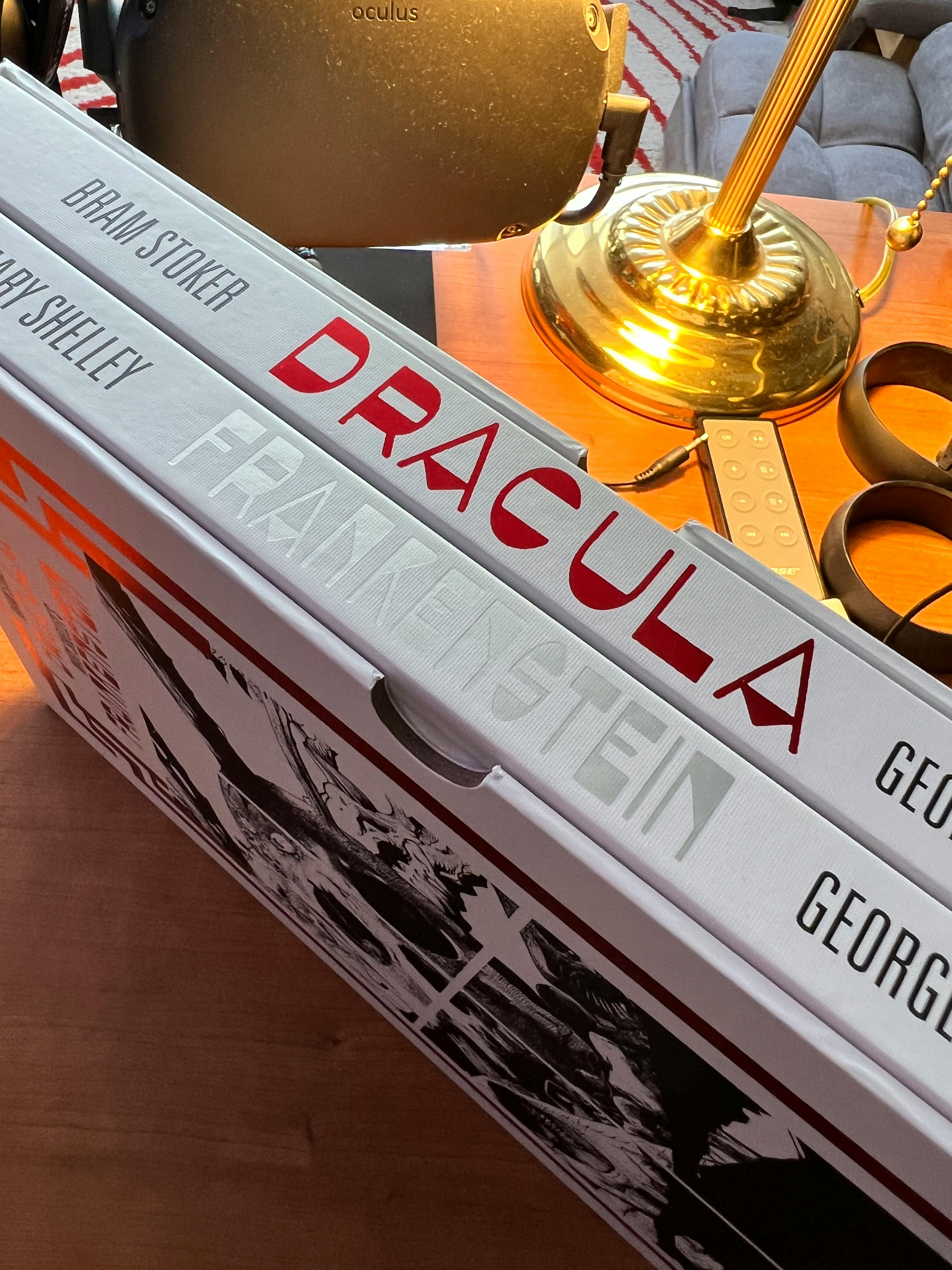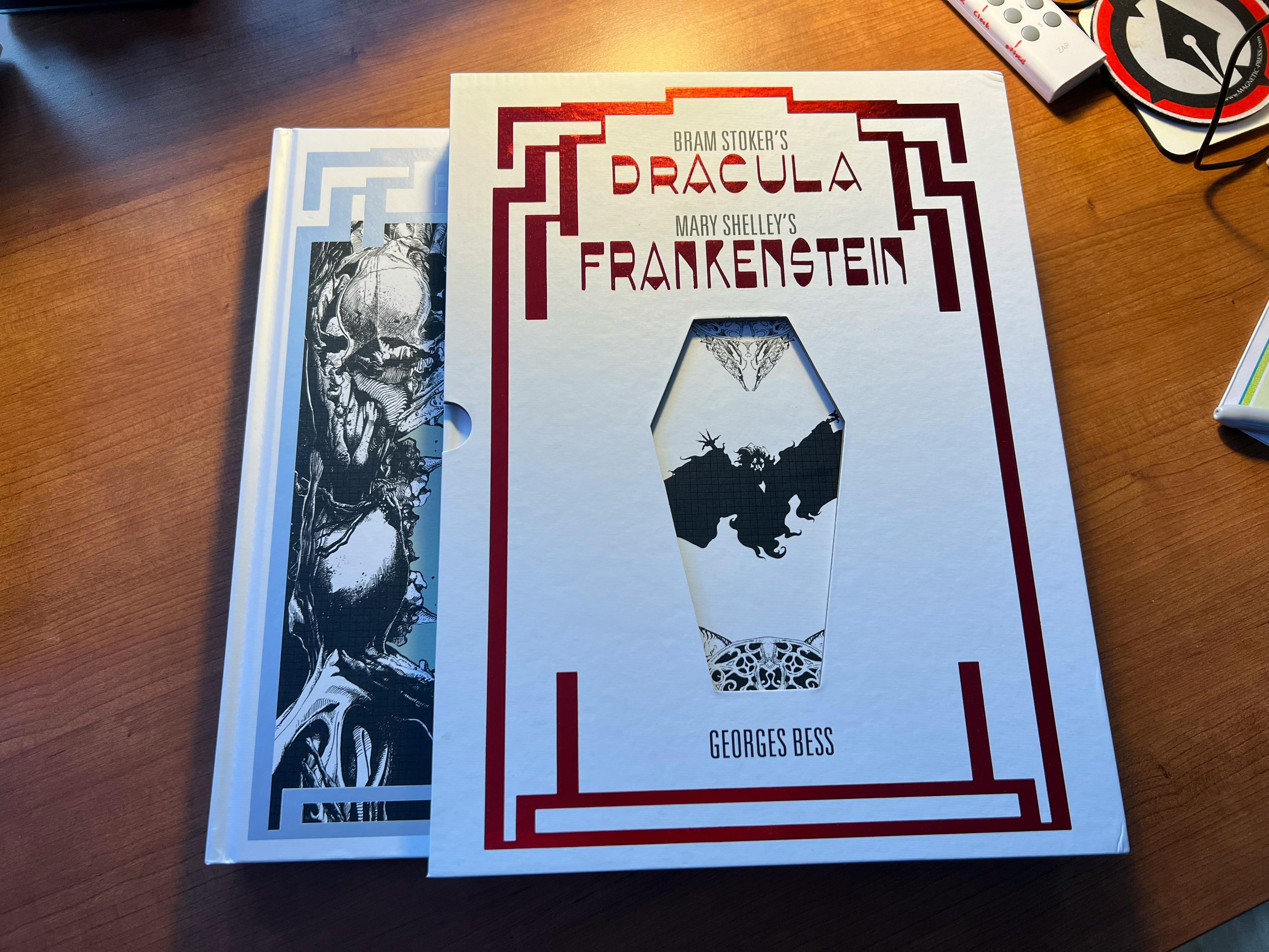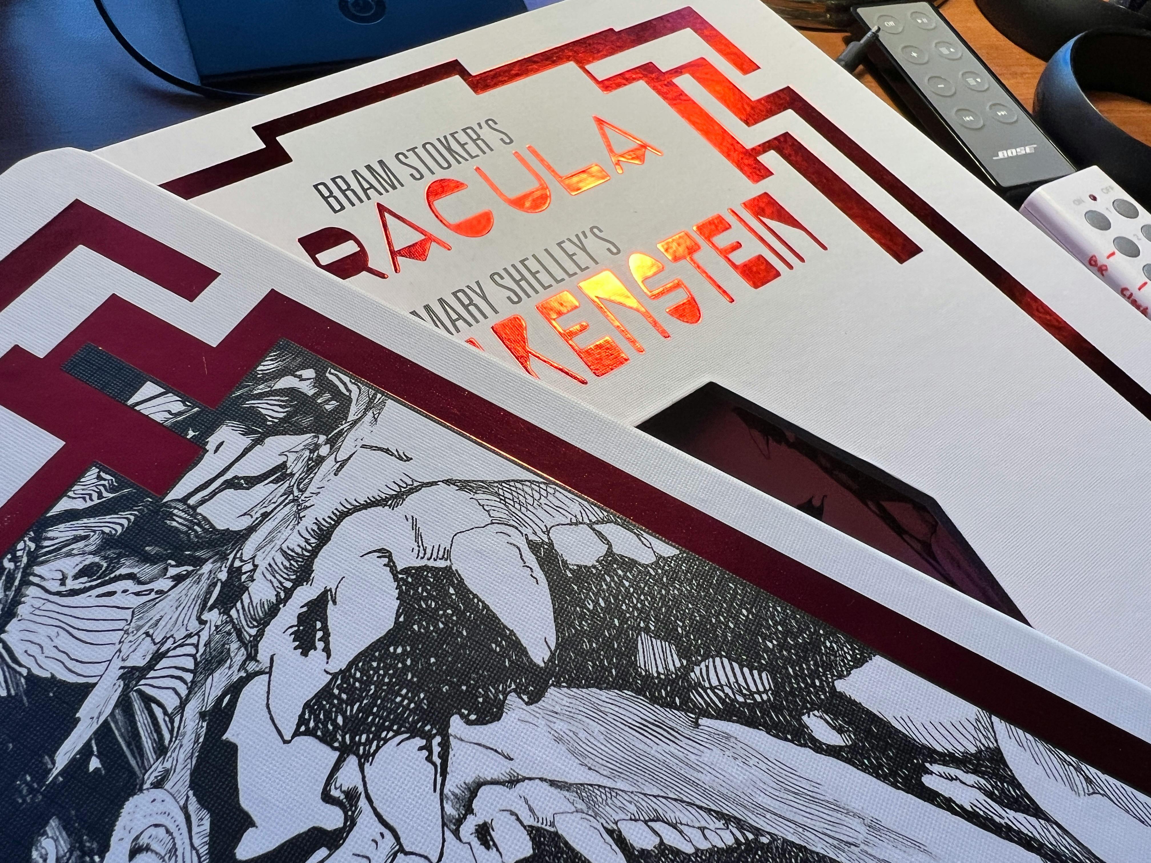 A shadowy stranger left a box in our package room last night, and it was full of AMAZING BOOKS! Specifically, advance copies of DRACULA and FRANKENSTEIN from our printer!