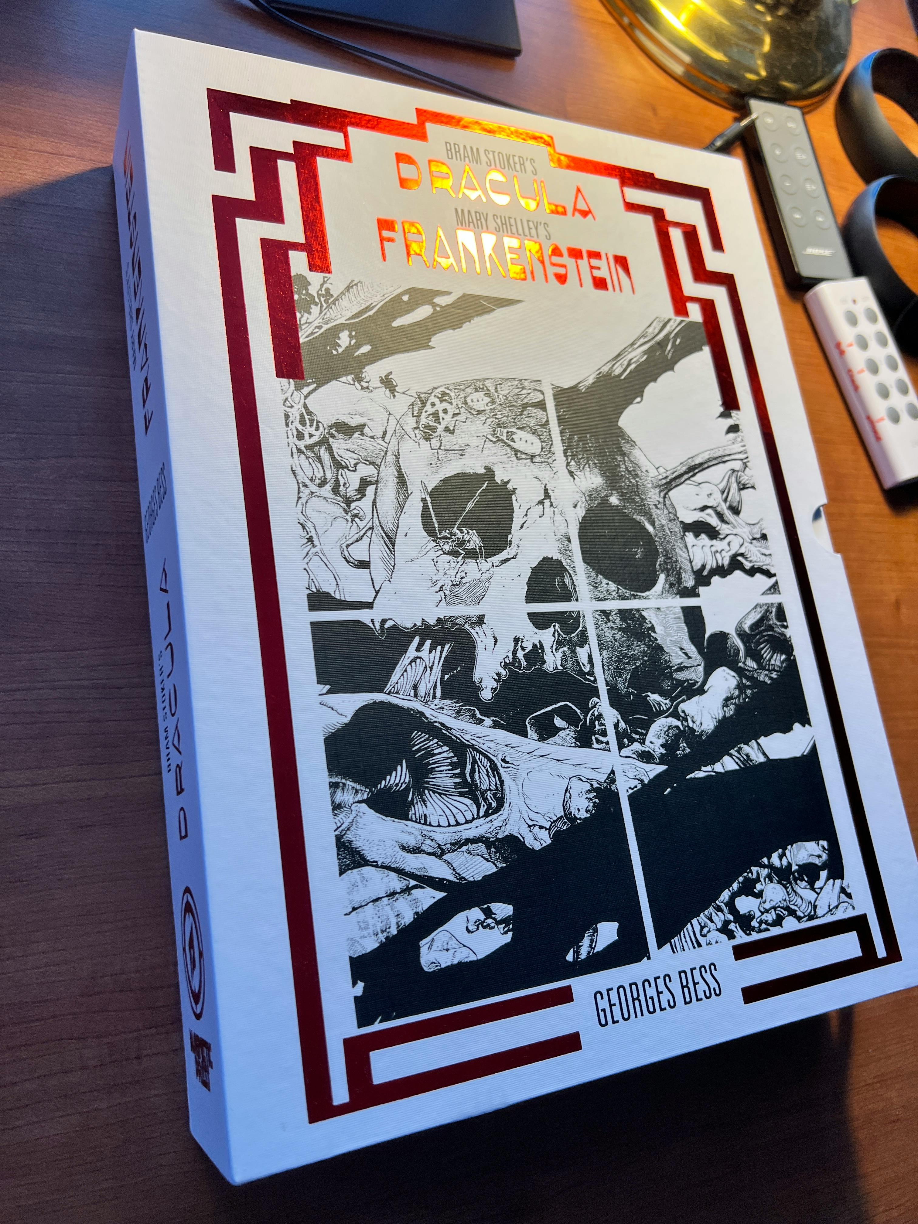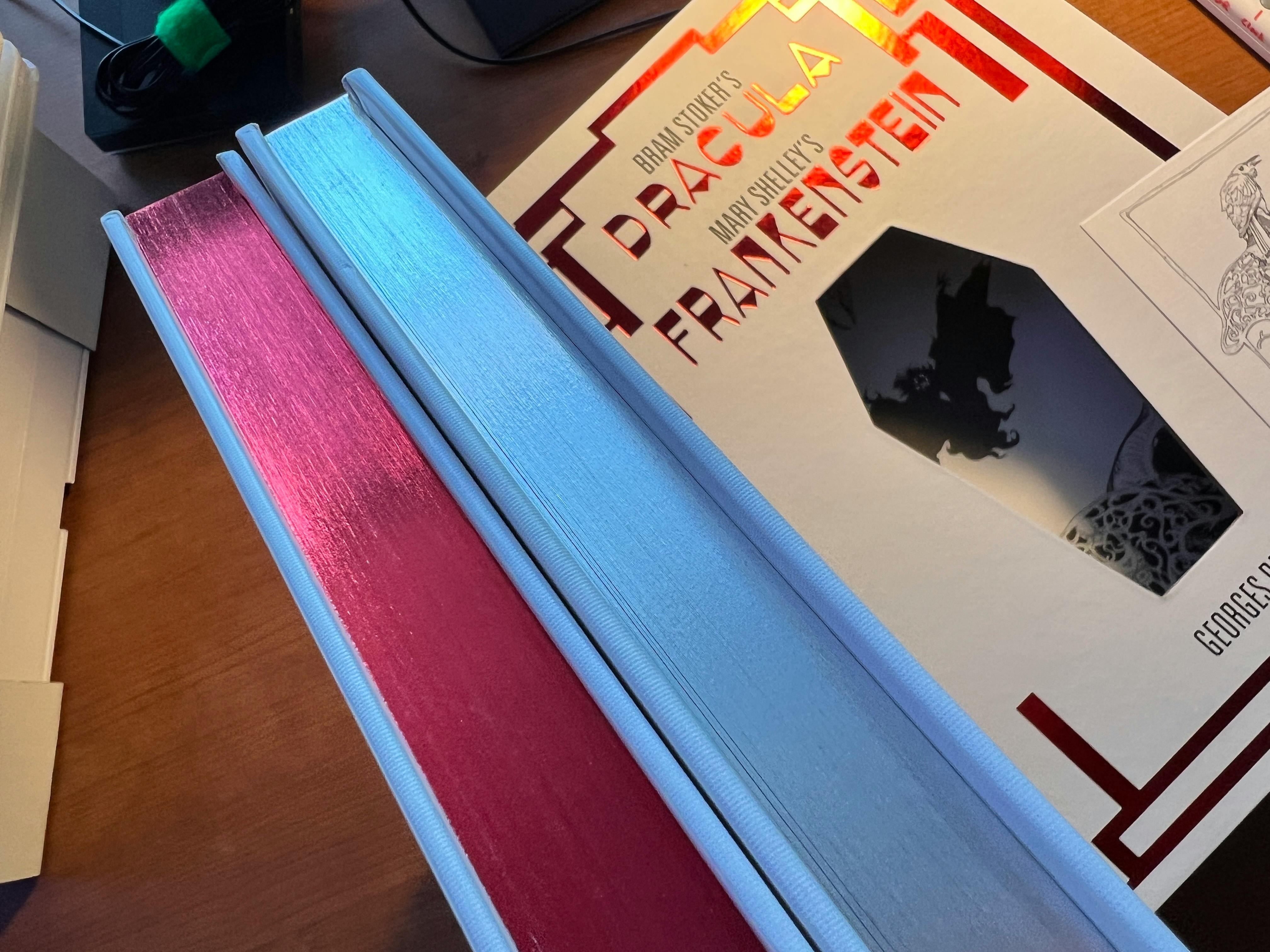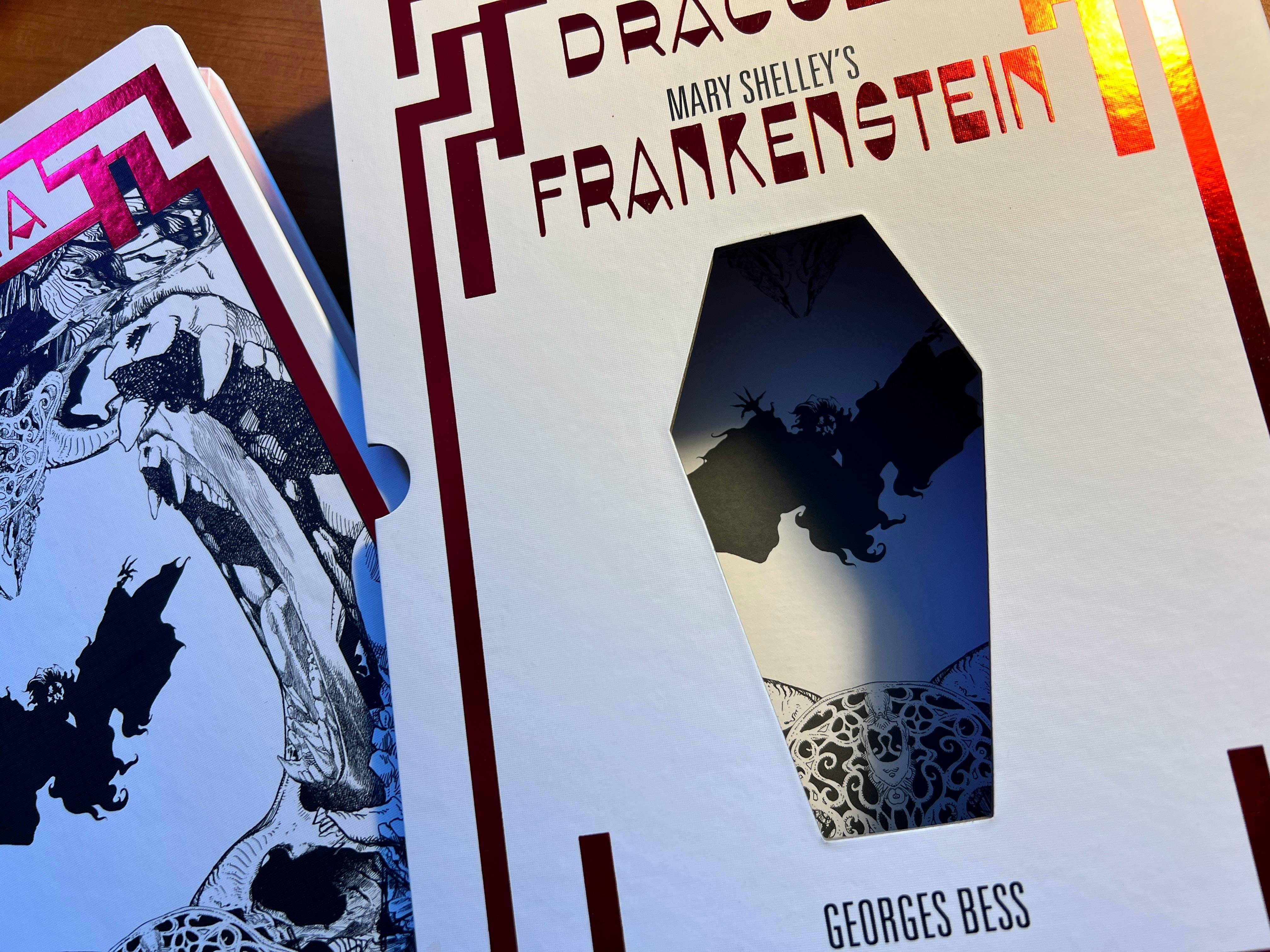 A shadowy stranger left a box in our package room last night, and it was full of AMAZING BOOKS! Specifically, advance copies of DRACULA and FRANKENSTEIN from our printer!