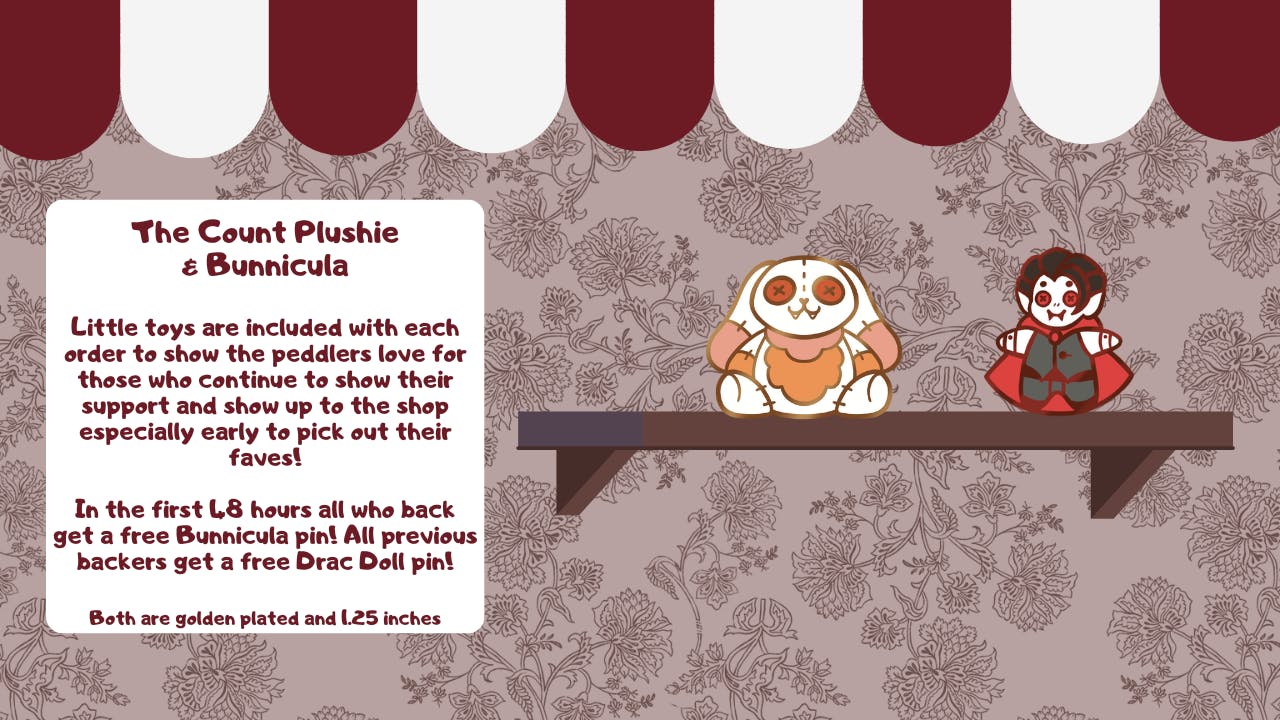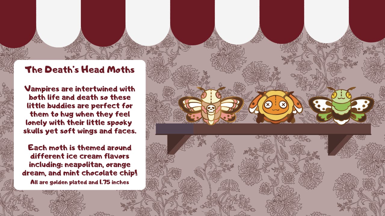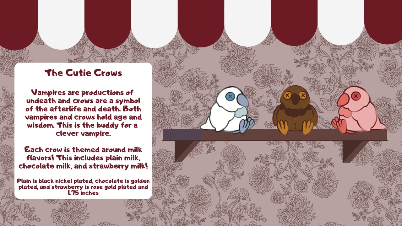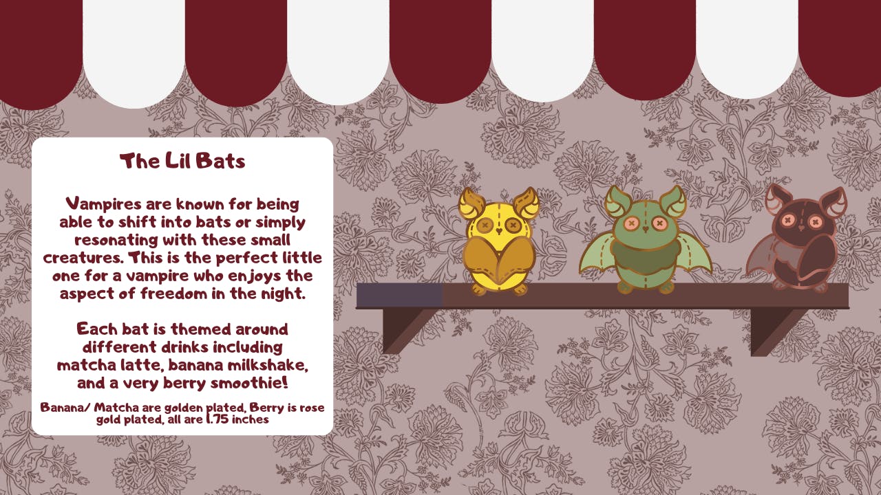 Welcome in to a shop which welcomes those who live in the darkness and offers plenty of strange trinkets along with little toys to fill your shelves and heart, no matter how still it may be. Enjoy pins based on animals vampires associate with!