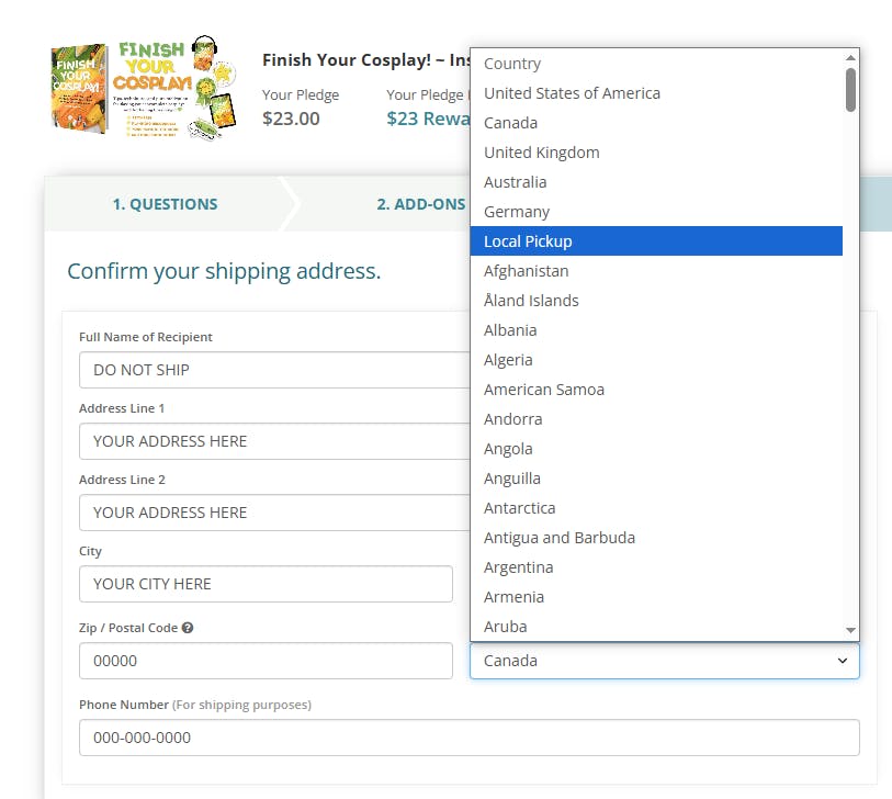 A reminder: if you'd like, local pickup is available for Cosplay America, Gen Con, and southwest Ohio. In the address section, instead of selecting your actual country select Local Pickup: