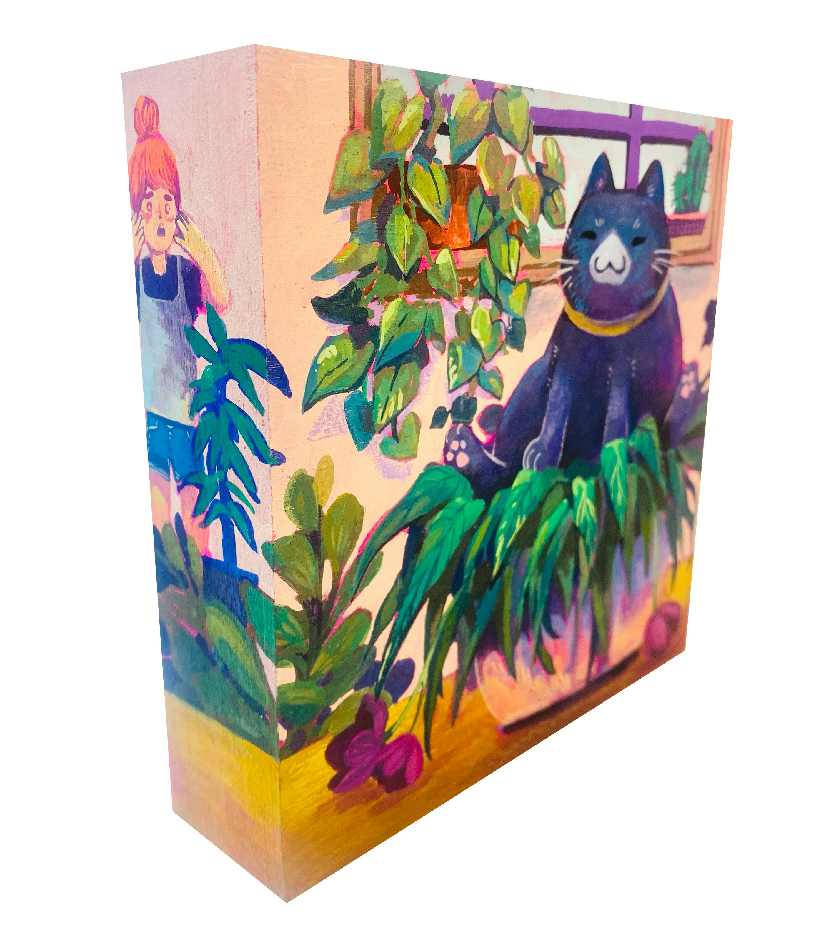 At the bottom of the panel, leaves dangle to illustrate all the plants that have suffered the wrath of this chunky gremlin. And on the edge, we have our victim, watching in horror as another one of their prized plants is destroyed.