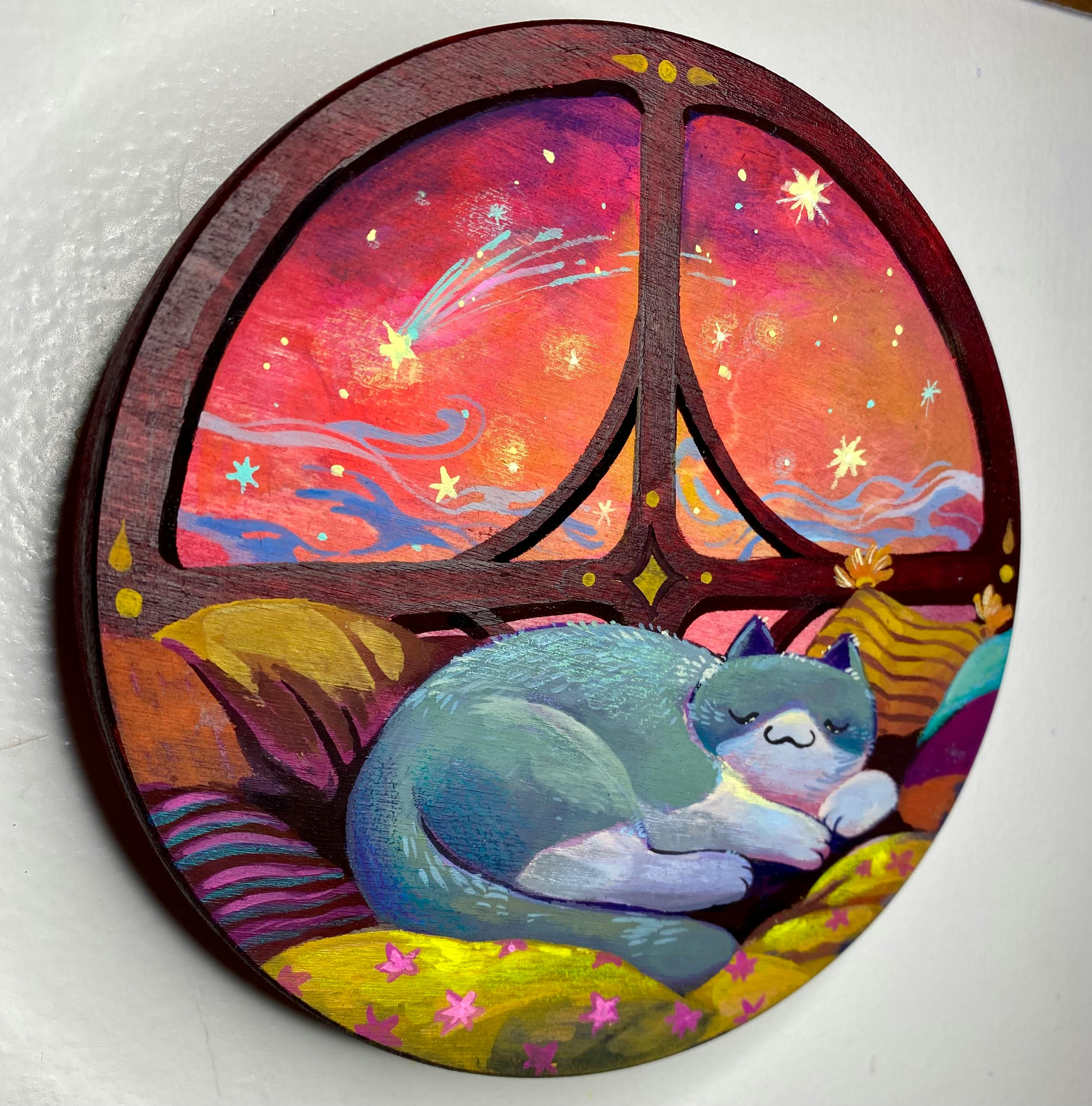 Our last piece features a sleepy angel who can do no wrong because he is sleeping. when he arises, that will be a different story, but for now, we can all enjoy how sweet and innocent he looks. claws tucked away, purring atop a mountain of squishy things.