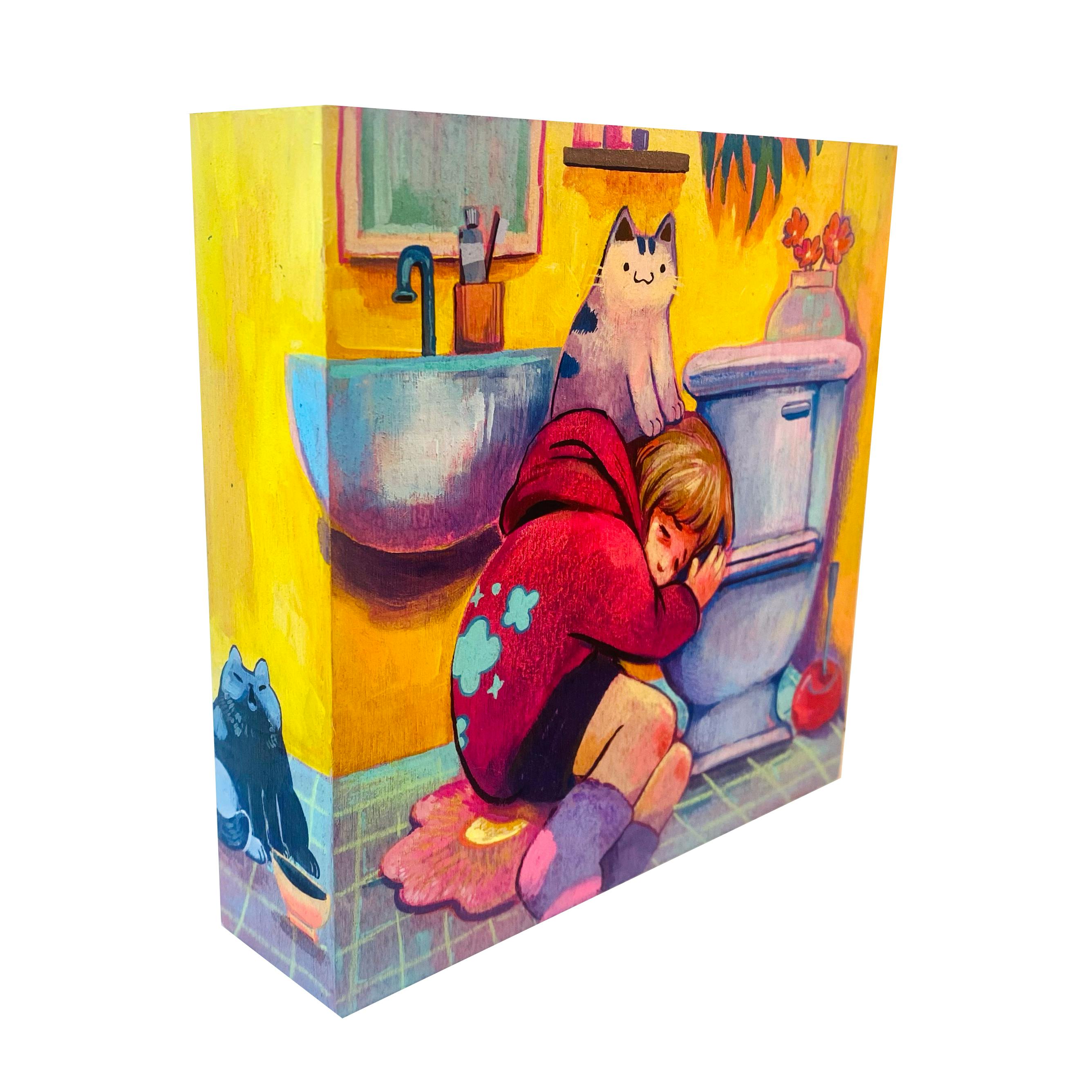 Our Third piece features a pathetic scene where we have a sick human on the toilet. They are not well, perhaps due to unwise life choices, but that doesn't seem to bother her furry gremlin companion. He stands on top of her, enjoying the view.