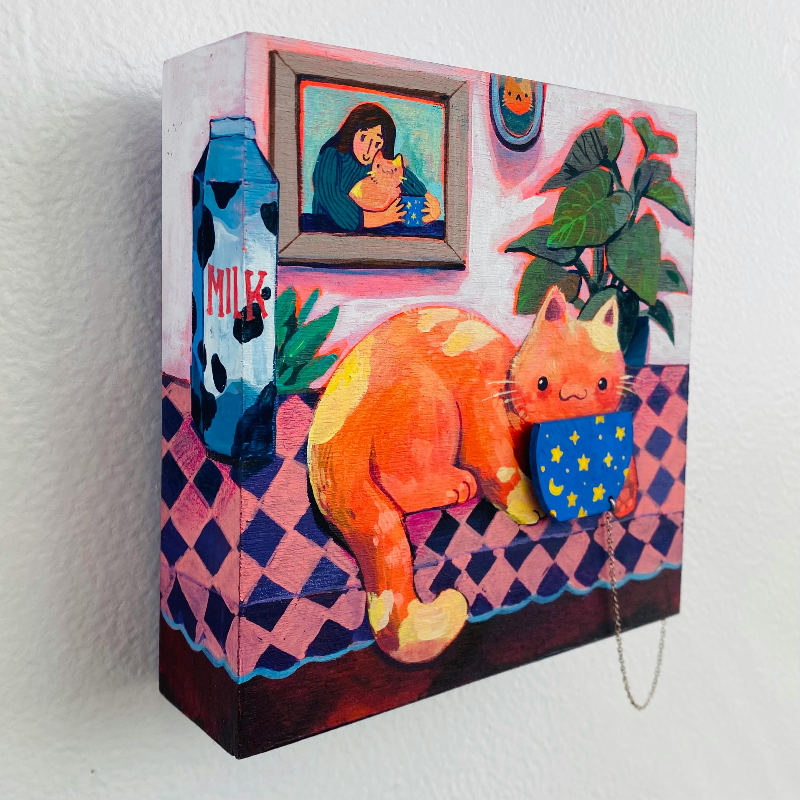 We start with " Sorry not sorry, about your Breakfast". The first concept that started this entire series. The bowl was laser cut and is attached to the painting magnetically as well as with a chain so that you, the viewer, can do the deed itself and knock over that cereal bowl.