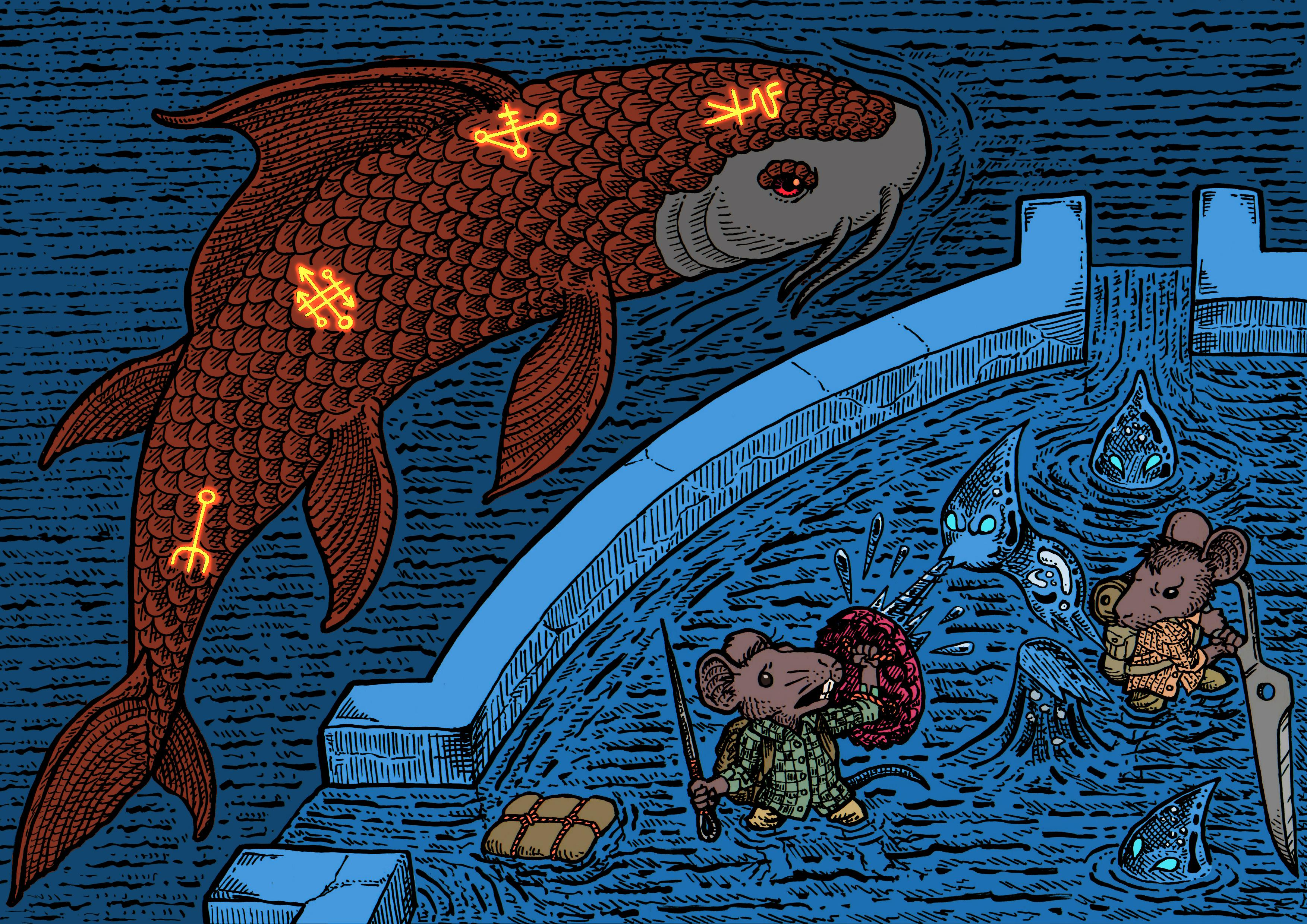 Korbin, the Koi Wizard lurks in the deeps as two adventurous mice battle Water Sprites in the Bubbling Fountain in the Rolling Coast pavilion.