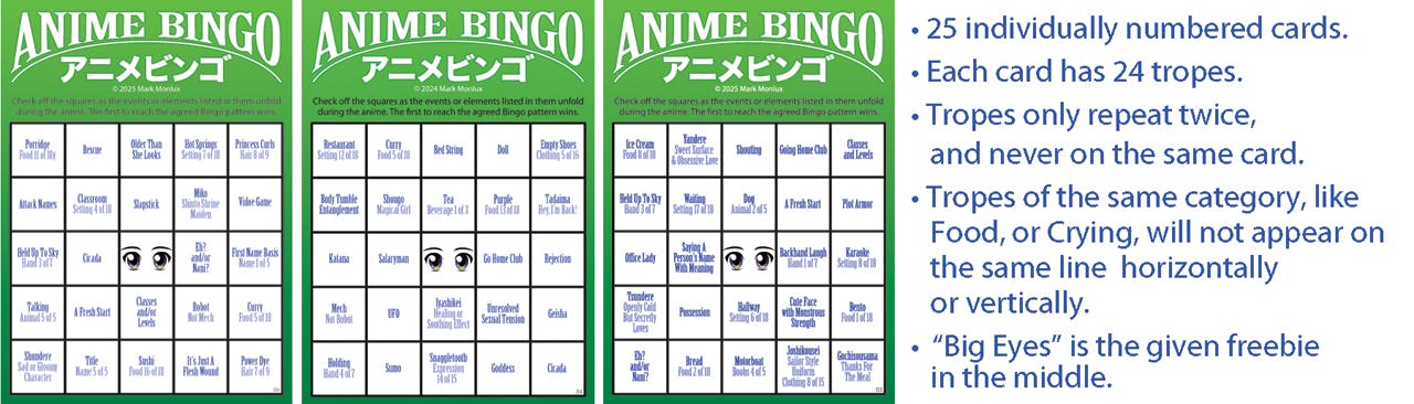 Anime Bingo is a set of 25 bingo cards featuring over 270 anime tropes. The game's goal is to call out all the Anime tropes on your cards as you watch an Anime. A "bingo" is an instant win.