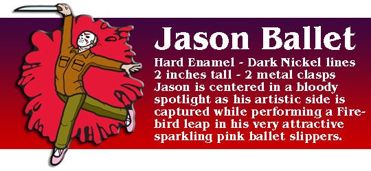 Jason Ballet That iconic hockey mask gets a stylish twist. Jason Ballet pins will feature a glittering pink ballet slipper, adding a touch of twisted elegance to this already terrifying killer.