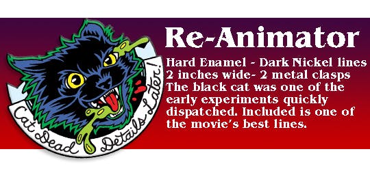 Re-Animator's Black Cat Fans of Re-Animator can't forget one of the earliest experiments. Nor the terrifying discoveries that came with it. Also unforgettable is one of the best lines in the film. "Cat dead, details later." This pin is a result of us reaching our first stretch goal.