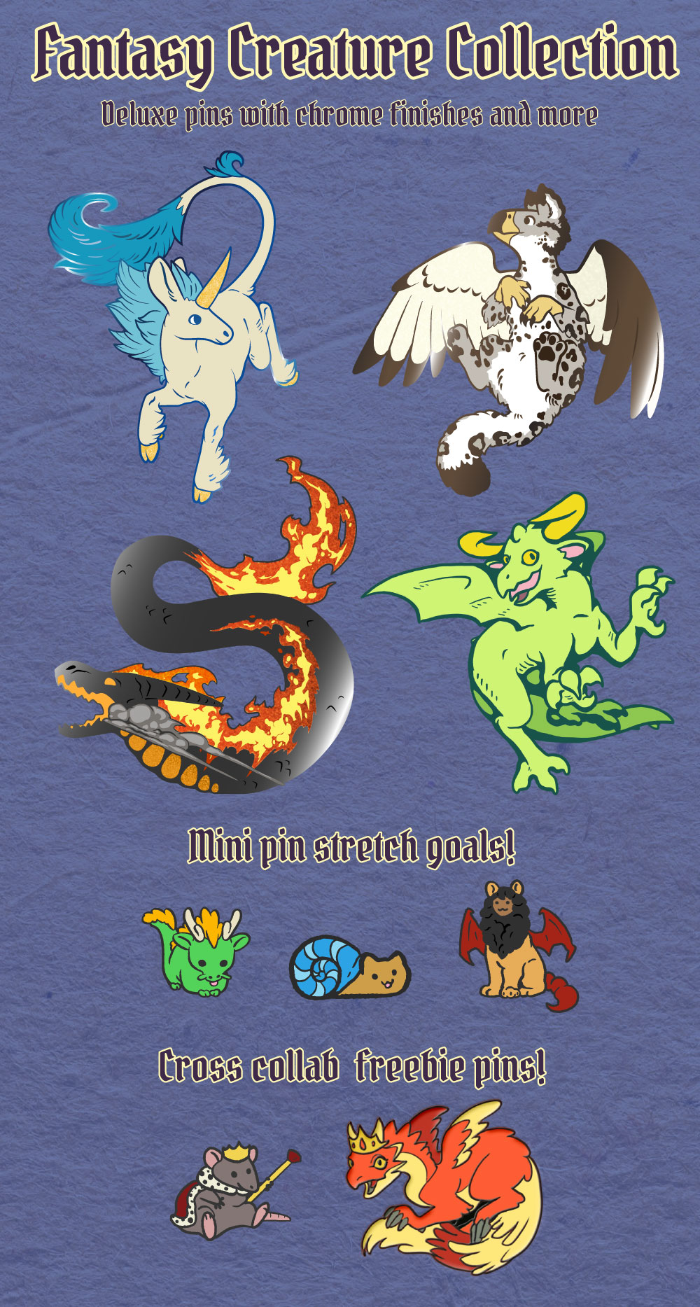 A collection of fantasy creature enamel pins designed with deluxe effects and processes- Pearlescents, chrome plating, transparency and glitters!