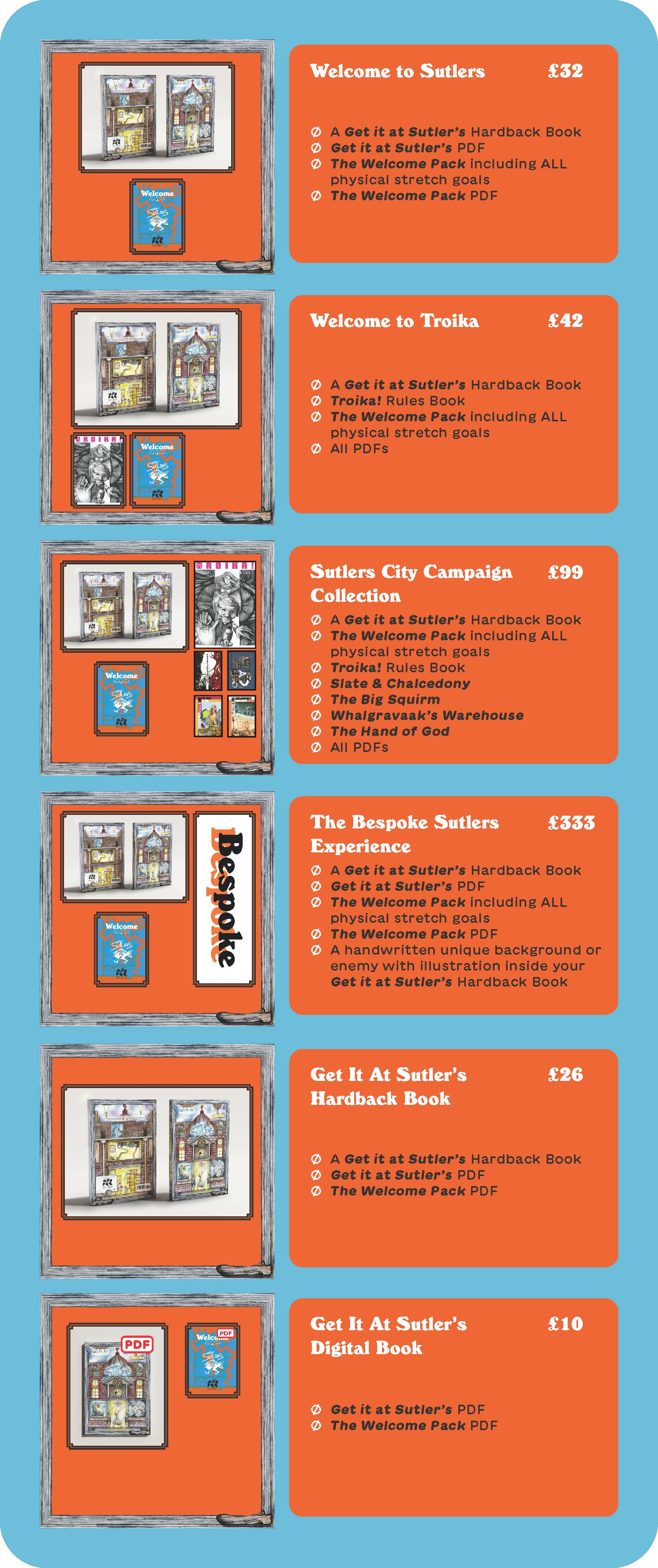 Get everything you need to play Get It At Sutlers in one economical bundle! This includes all the rules required to start playing TROIKA! The Science-Fantasy RPG and Get It At Sutlers right away, along with all unlocked stretch goals in the Welcome Pack.