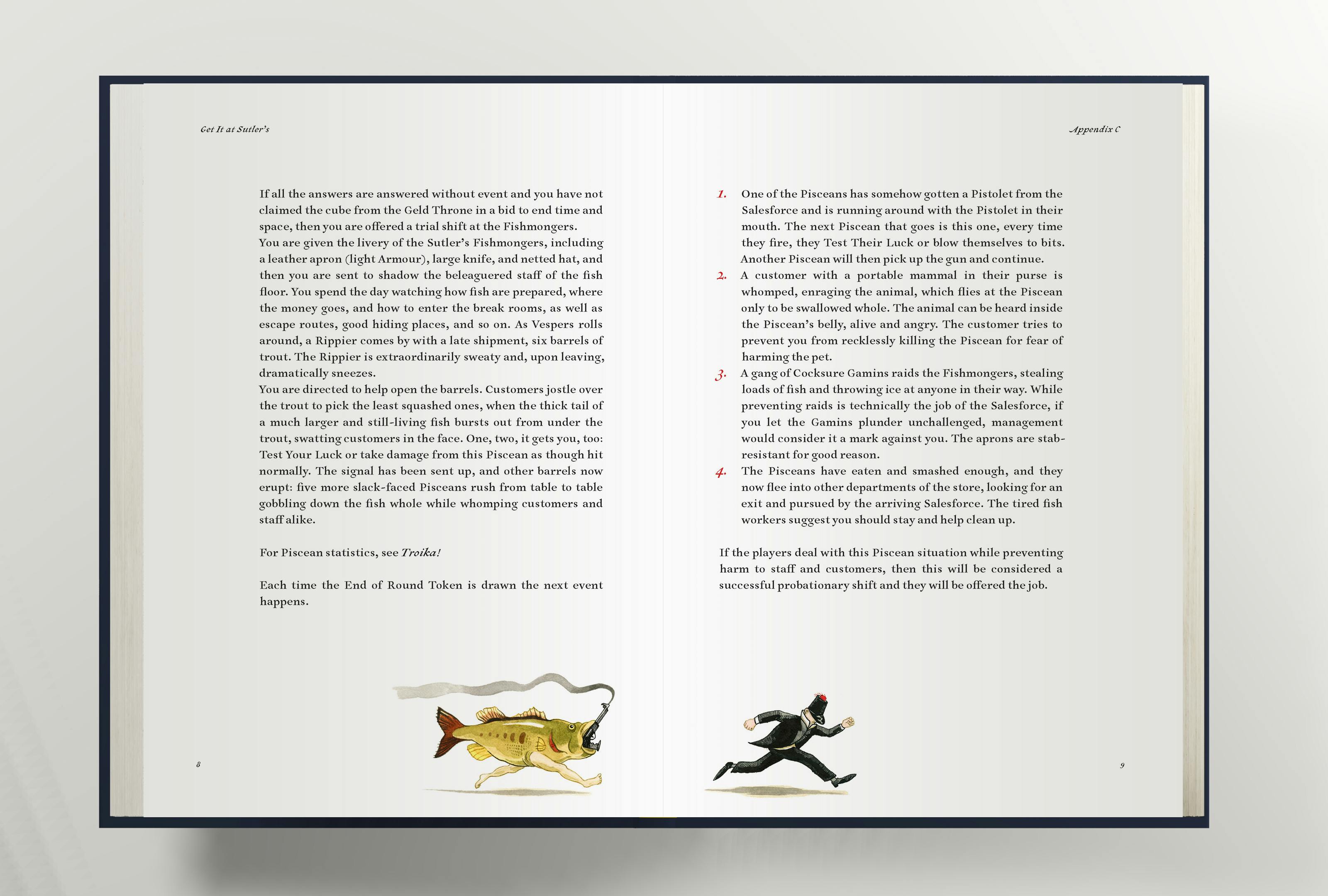 The book starts with a structured adventure to get the party hired and serving their first day at work, and then it opens up into hundreds (!) of random encounters and micro adventures. Once hired, they can decide to work at the store at any time, without warning, and Get It At Sutlers will make it effortless to guide them through encountering the citizens of Troika across hundreds of strange incidents. Just roll up a day at work, play out what happens, and get those player characters paid. Never again run out of material for your sandbox campaigns!