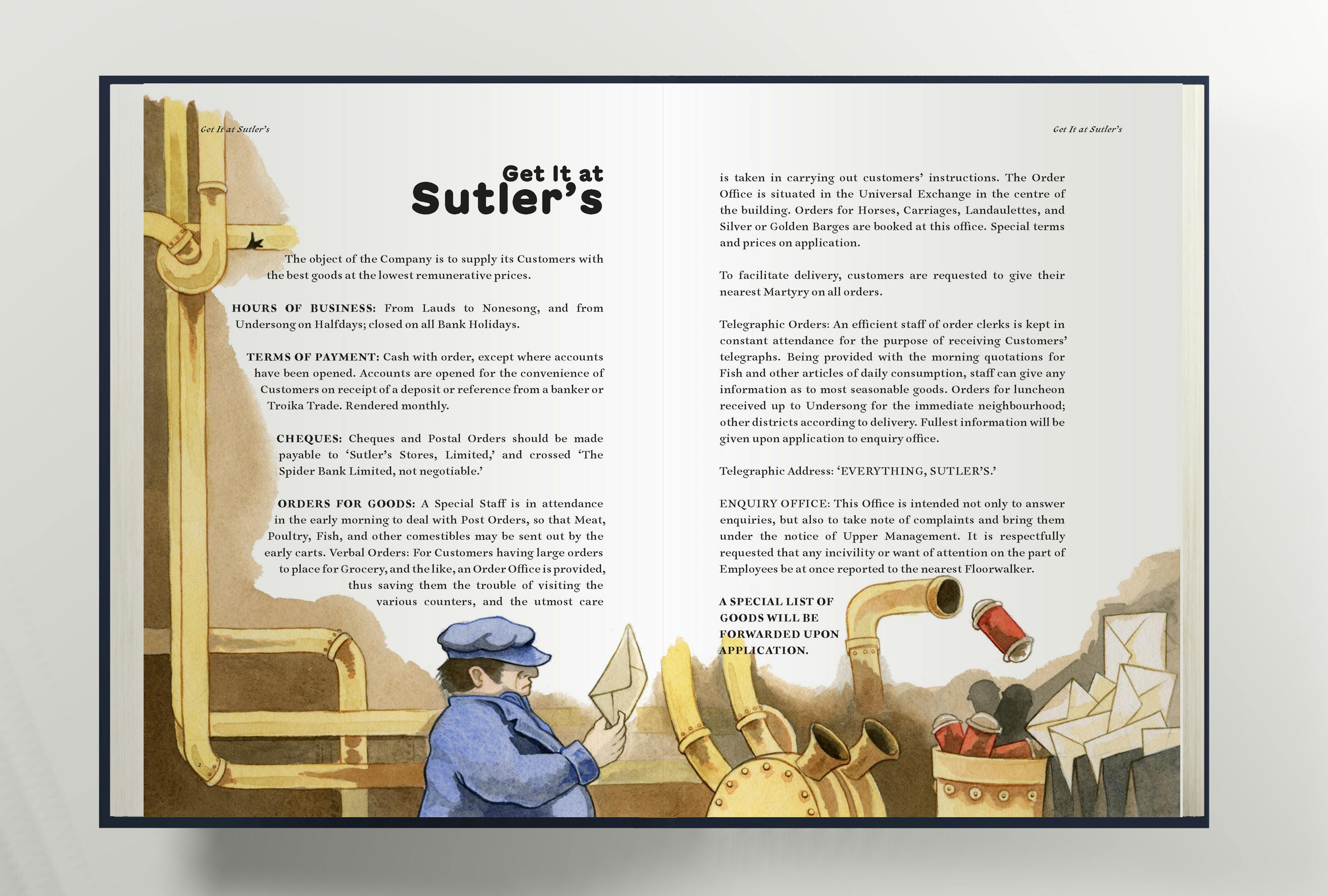 In addition to a beautiful hardback copy of Get It At Sutlers you will also be getting an exclusive Welcome Pack. The Welcome Pack contains your contract of employment and a code of conduct leaflet. Please read all documentation thoroughly before attending your first shift. Sutlers LTD takes no responsibility for injury or death while on the premises.